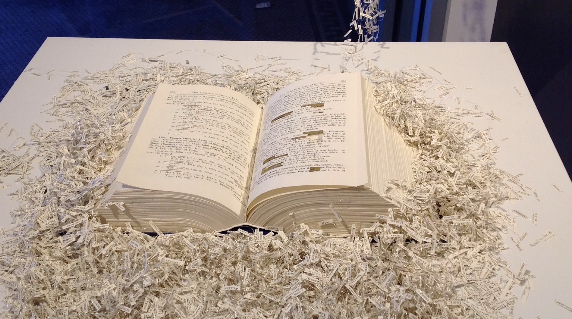 VHF Salvation is a King James Version of the Holy Bible altered with a multitude of ribbon placeholders protruding from its lower edge to provide the “very high frequency” means of “saving one’s place“. In a special issue of Visible Language, Renée Riese Hubert describes the work as an “aggressive antibook” (p. 130). Even though VHF Salvation preserves the book being altered — unlike Beube’s Ashes diptych (above), which alters the book or books beyond recognition — some viewers might nevertheless have felt as uneasy as some viewers of Meg Hitchcock’s more aggressive alterations of the Bible, Koran and Bhavagad Gita.