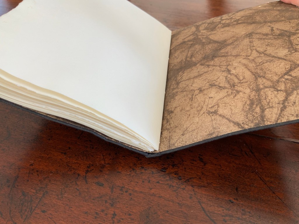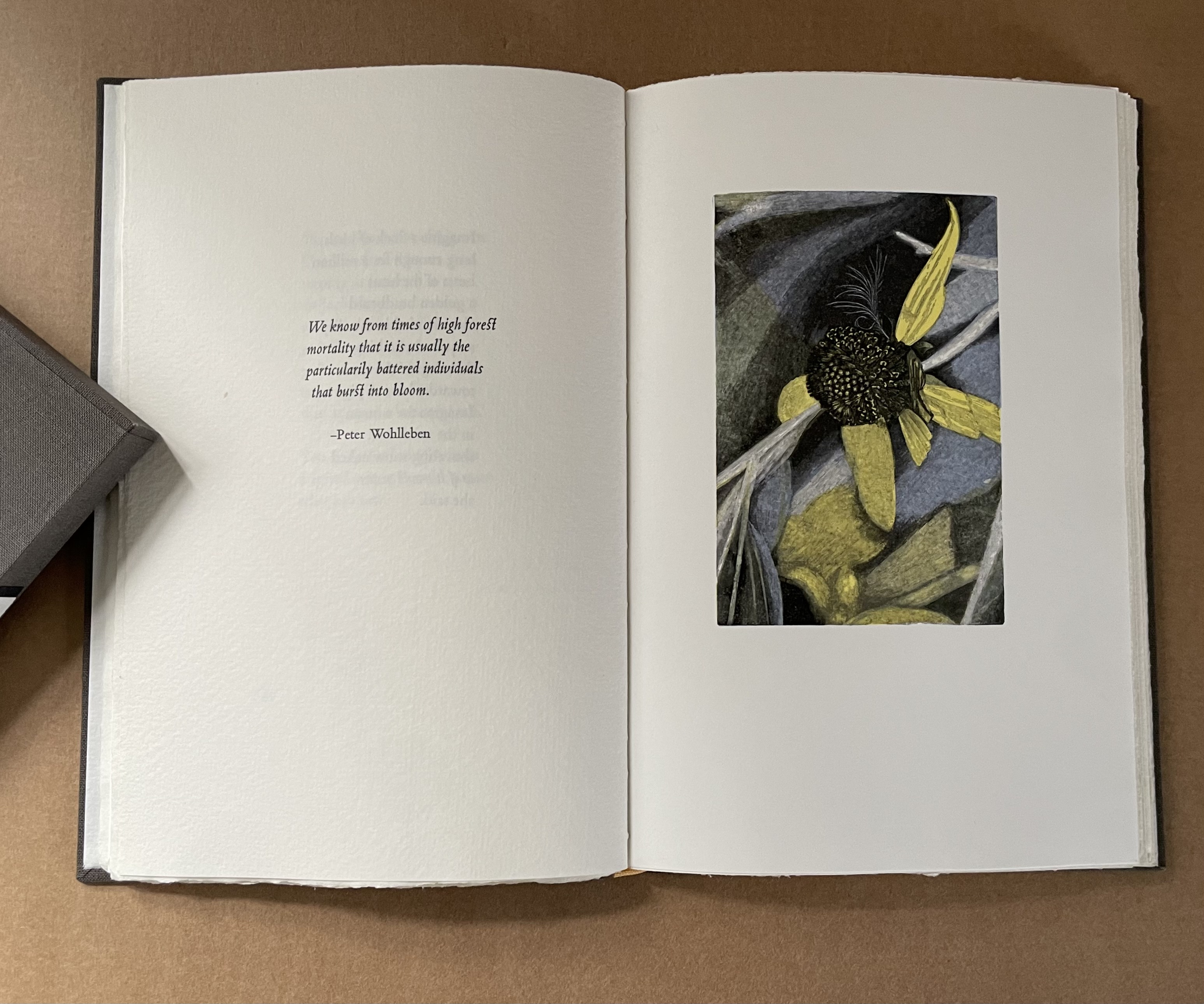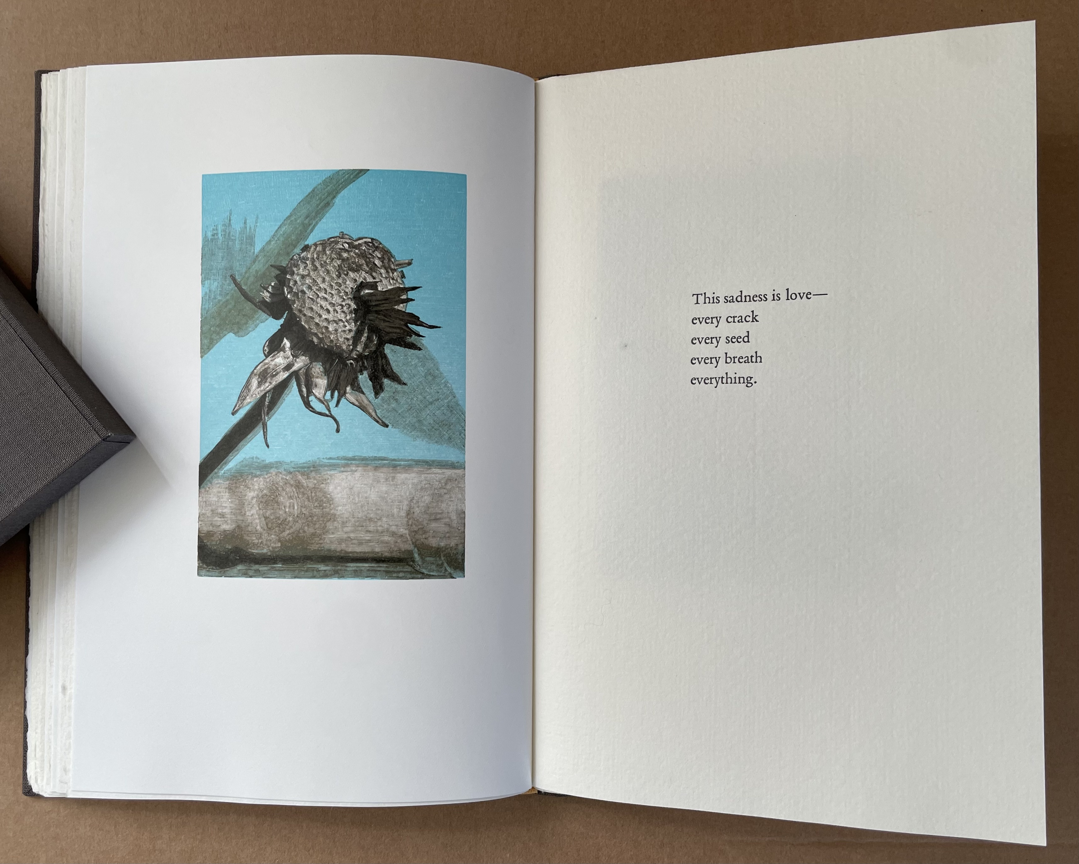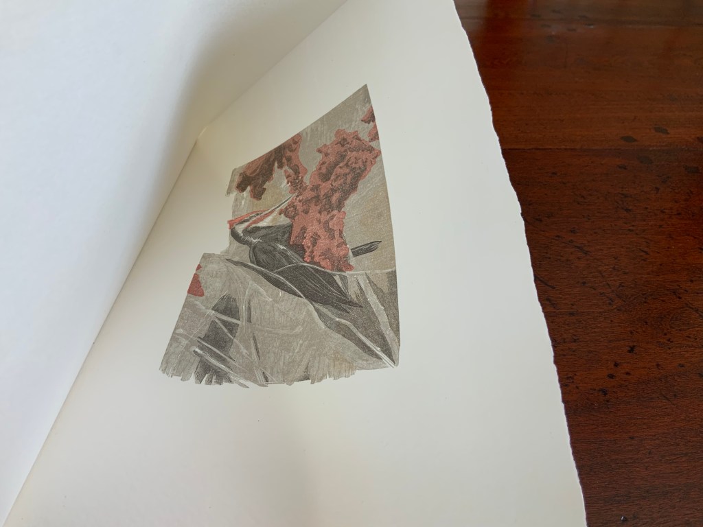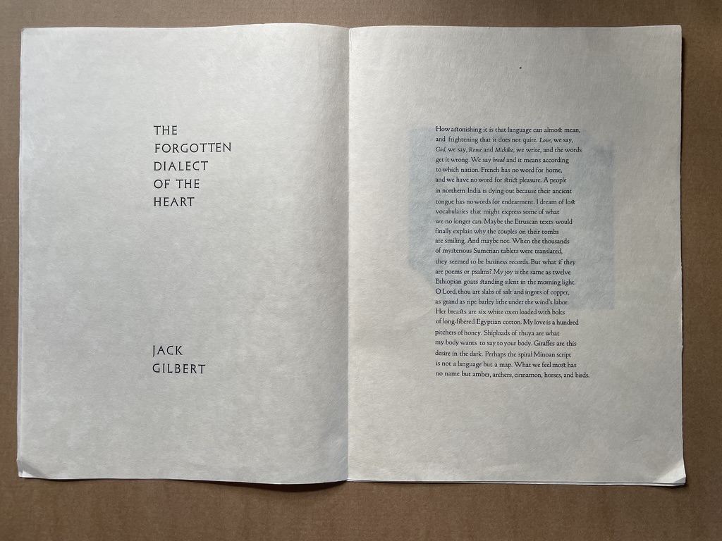 Fourth, Morice’s book first appeared in 1980 as a limited letterpress sewn pamphlet published by Allan and Cinda Kornblum’s Toothpaste Press. In the late 1960s, they had studied typography and printing under Harry Duncan at the University of Iowa, then set up their publishing house in 1970. Poetry dominated the list, with output from Robert Bly, Robert Creeley, Anselm Hollo, Antonio Machado (translated by Bly), Alice Notley, Carl Rakowski and Anne Waldman. This edition comes from Coffee House Press, founded in 1984 as the nonprofit successor to Toothpaste Press. Although no longer a product of letterpress printing but in a nod toward its predecessor, the book boasts case binding with red cloth over board and dark green textured pastedowns and endleaves (doublures). And this at a time when the doom of the printed book was being regularly forecast. This hints, at least, at the proposition celebrated by the collection that book art forecasts the history of the book.