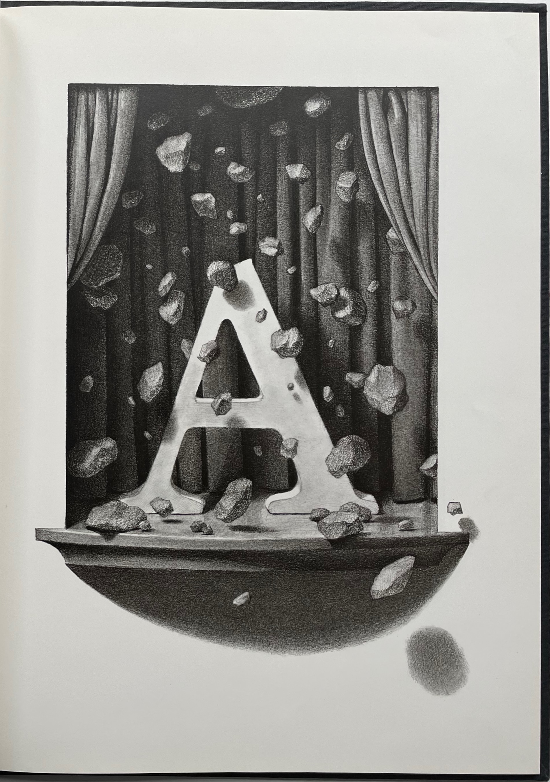 Caslon has featured in such outstanding books as Oliver Byrne’s The First Six Books of the Elements of Euclid: In Which Coloured Diagrams and Symbols Are Used Instead of Letters (1847), nearly an artist’s book in its own right. Dern might have been more immediately inspired, however, by Chris Van Allsburg’s whimsical children’s book The Z was Zapped: A Play in Twenty-six Acts, Performed by the Caslon Players (1987). From the start, bending the alphabet full circle to the ampersand, Dern’s own whimsy extends beyond the letters themselves.