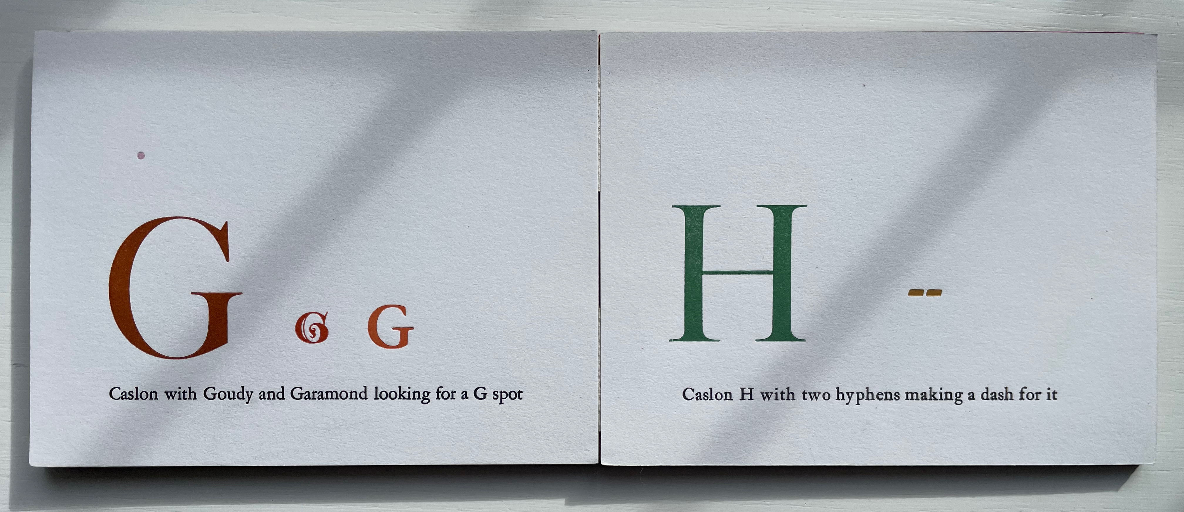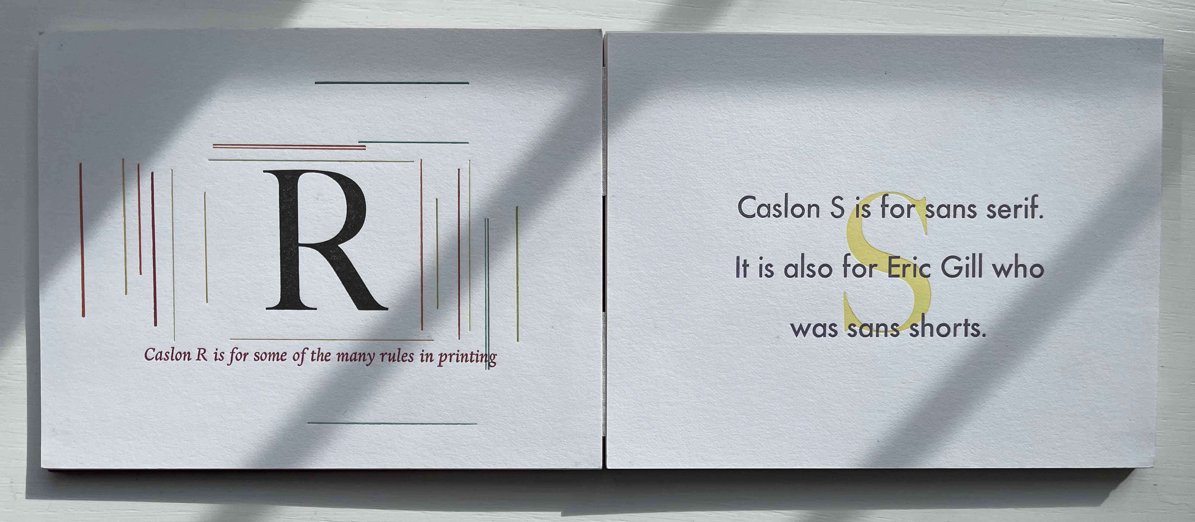 Given its age and dignity, Caslon attracted a fair amount of rock throwing from designers (especially in the 20th century). While Dern may have her own whimsical fun with Caslon, she doesn’t let the rock-throwers off scot free. Her Caslon’s G puts Frederic Goudy on notice that size does matter, and the Caslon S reminds Eric Gill of the emperor’s new clothes.