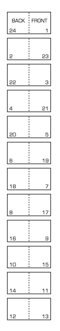 The six embossed and debossed drawings were created from wire forms pressed into dampened sheets of paper. Turn Over Darling elegantly combines King’s sculptural skills with his printer’s skills. When folded and juxtaposed in sequence, they make for eleven reclining female nude images that change position from front to back view as the pages turn. Determining the folds and sequence is a form of imposition, although quite different from the usual imposition for a single sheet with twelve pages on either side as shown below. Again, here is a work that evokes a joy in the material and in its handling.