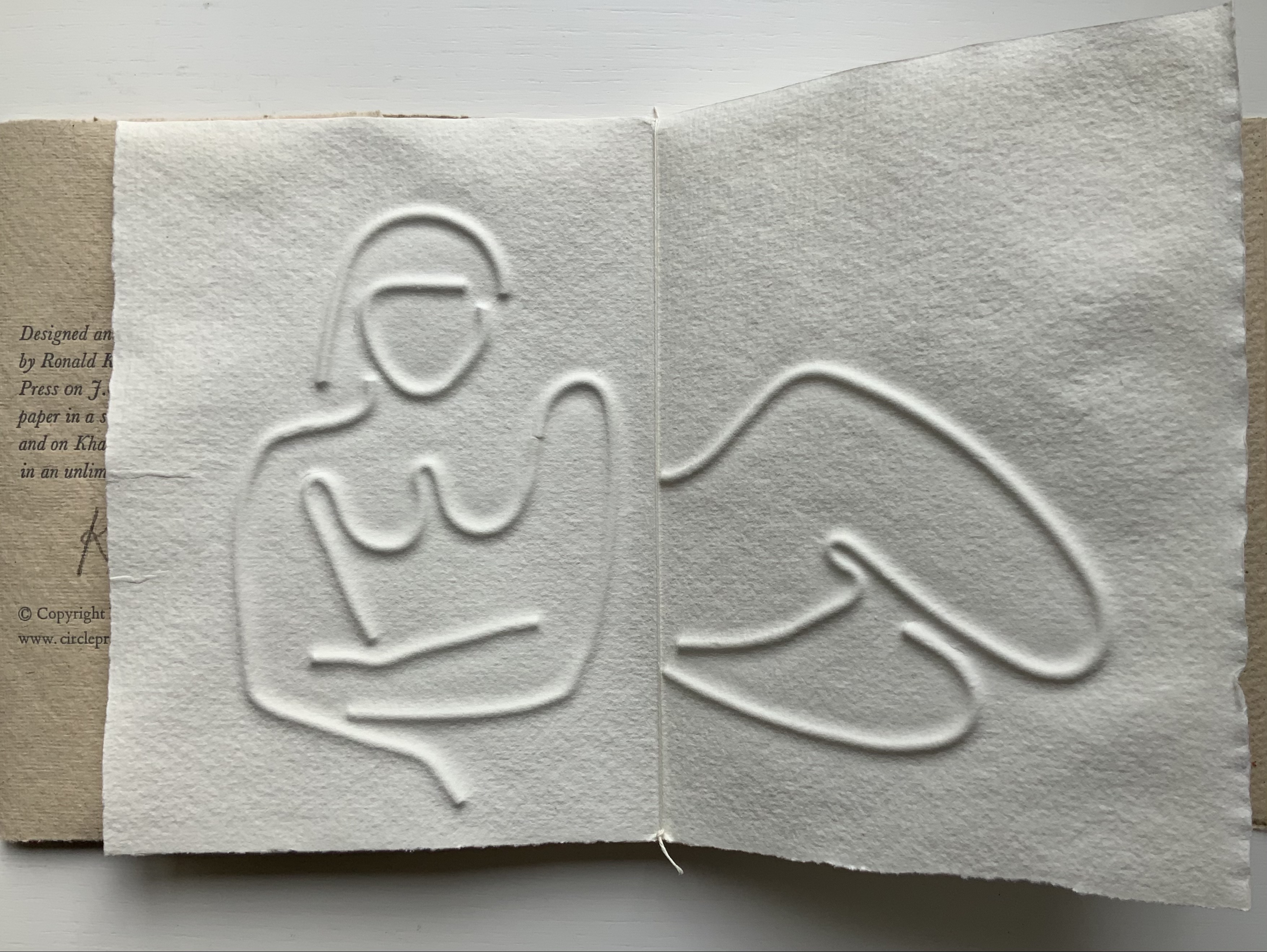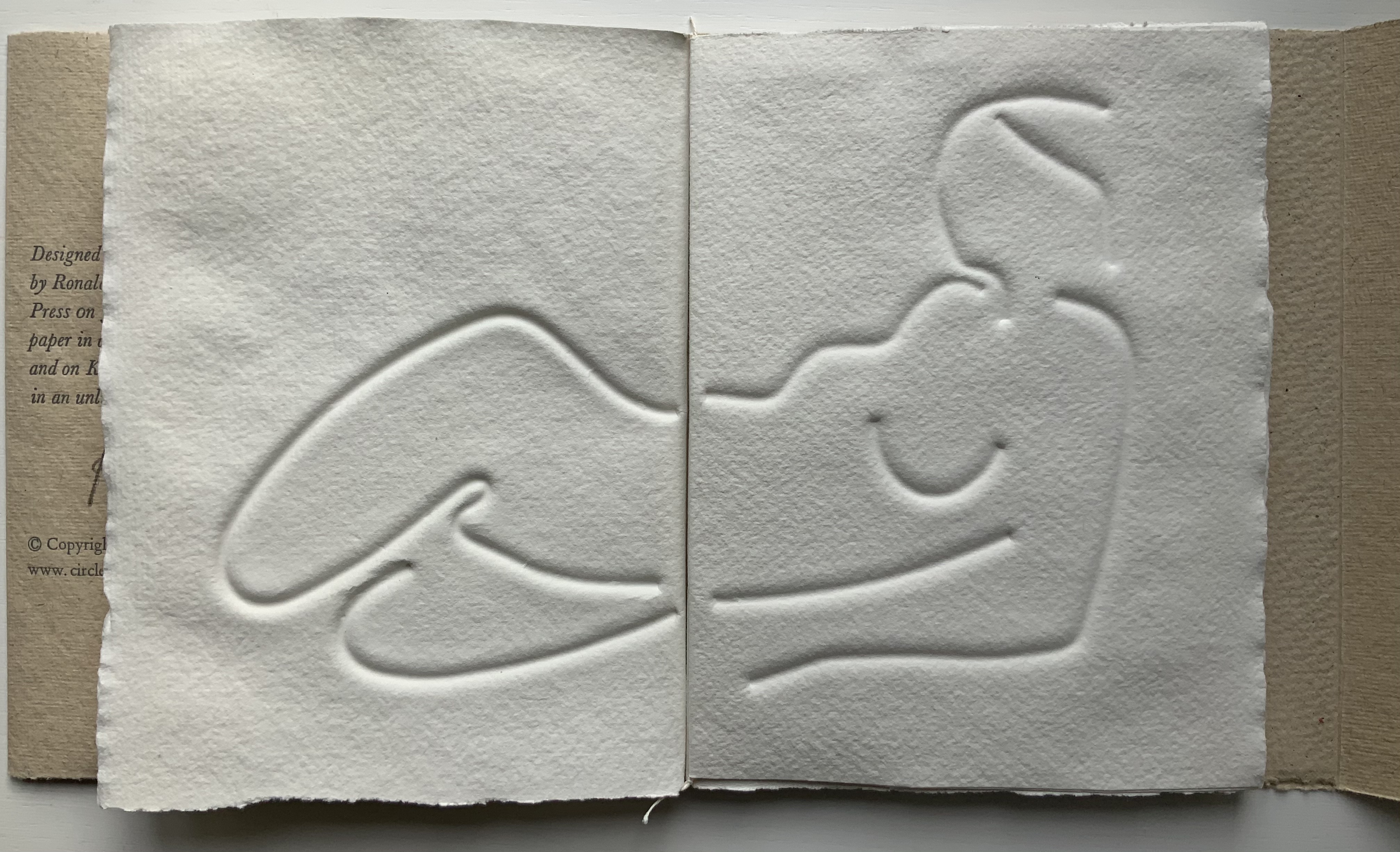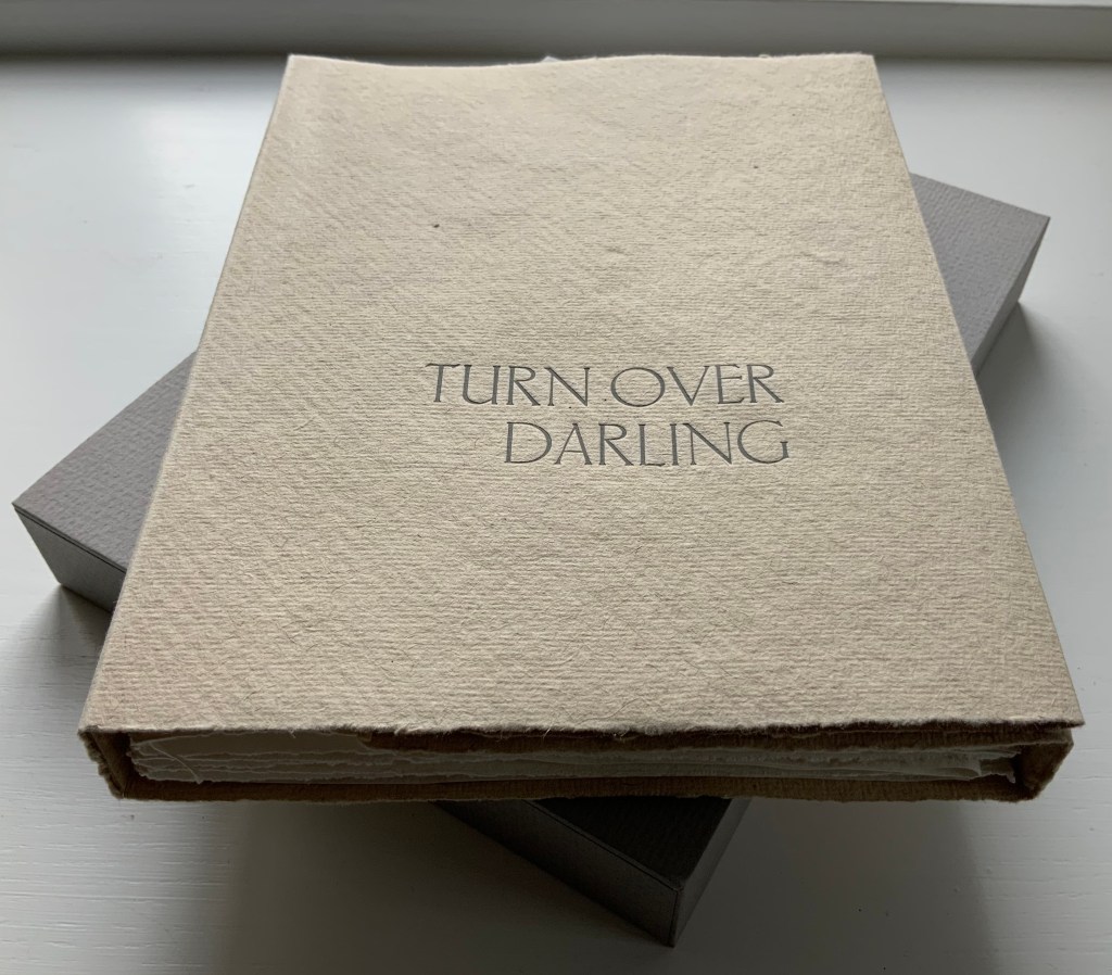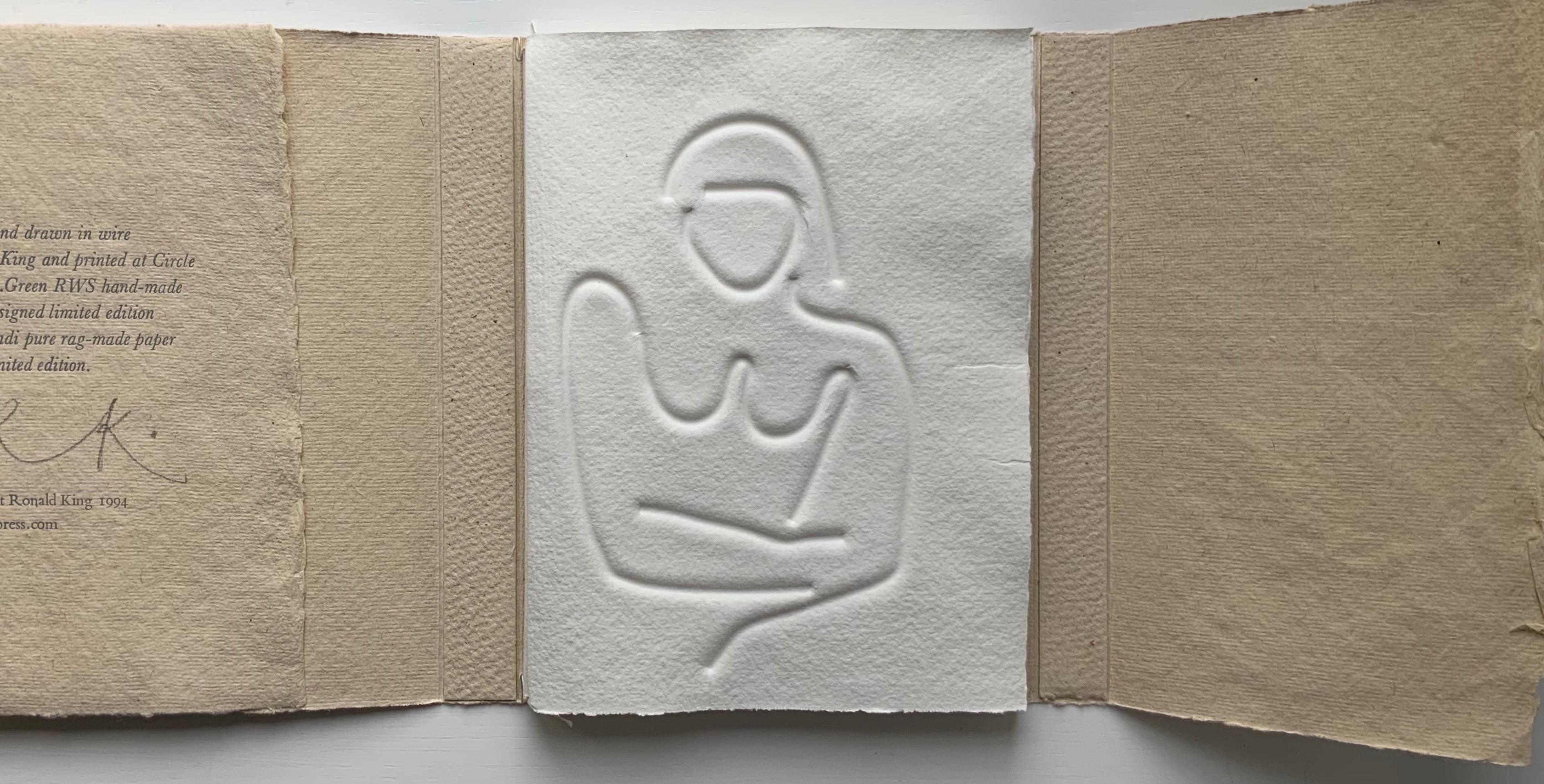 Turn Over Darling (1994) Ron King Slipcase (H204 x W153 x D28 mm) containing a light brown paper portfolio (H195 x W150 x D24) into which are hand-sewn six sheets (H190 x W282) of J. Green RWS hand-made paper, folded in half, bearing embossed and debossed images of a female figure. A signed copy from the limited edition of 75. Acquired from the artist, 1 December 2020. Photos: Books On Books Collection, displayed with artist’s permission.