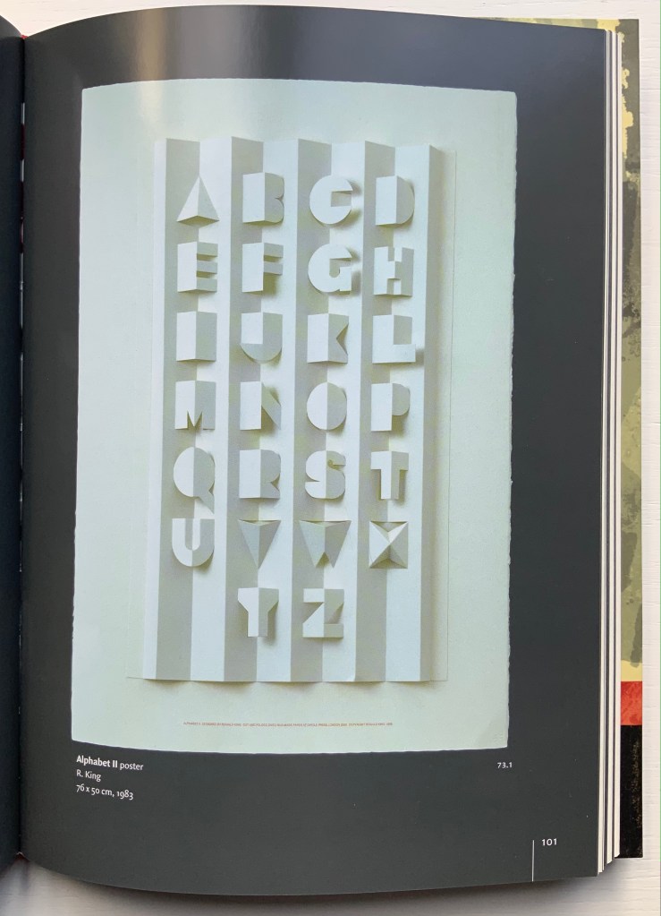 The “abc” series displays the restrained, minimalist side of King’s inventiveness. With more than one of these works to hand, his enjoyment and humor come through — especially in the subtle and not-so-subtle variations. Take alphabeta concertina miniscule as an example. It arrived like a long awaited chuckle after the majuscule version — Alphabeta Concertina (1983) — which had been expanded into the poster versions Alphabet I and Alphabet II (below). Size and surprise seem to matter in King’s sense of humor. For size, see the large-scale steel version of the alphabet in 2016. For surprise, consider his catalogue raisonné Cooking the Books or this set of paperweights.