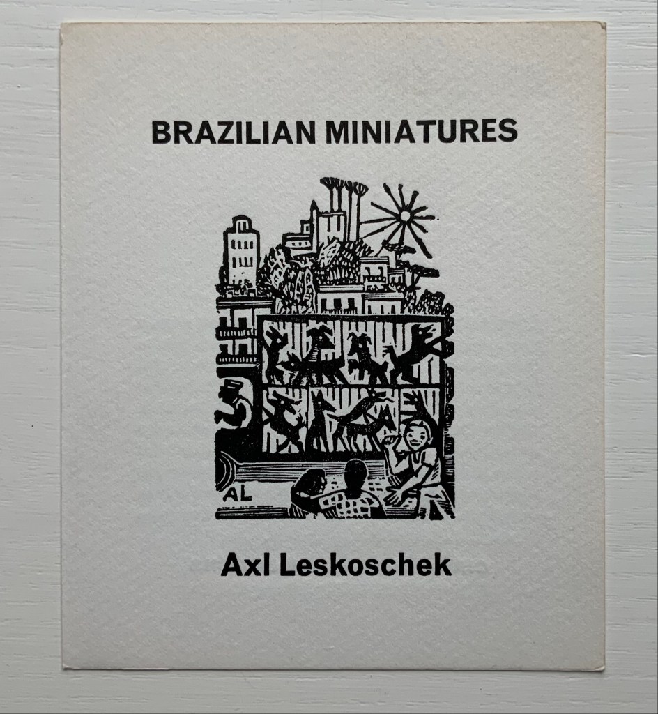 Announcement (card, line block reproduction, H150 x W125 mm) of the 200 portfolios of fifty-one woodcut designs reproduced from the only remaining proofs of Brazilian Miniatures, an unpublished book with a bilingual introduction; printed in two versions. 1973?