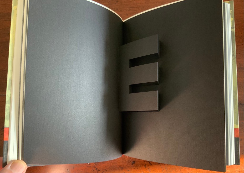 Of the few other pairs of couplets in the book, none is as back and forth as the letter z’s. Paired against one another, rhyming abab, each line beginning alike with its N-z phrase, the two couplets echo the back-to-backness and balance of the dos-à-dos structure. The phrases self-righteous space and tender absence can be read as allusions to the cut-out space around the letters. Or vice versa. Again, back and forth. “Angry” and “tender” bat each other back and forth, just as the final phrase turns the dos-à-dos sweetly back on itself.
