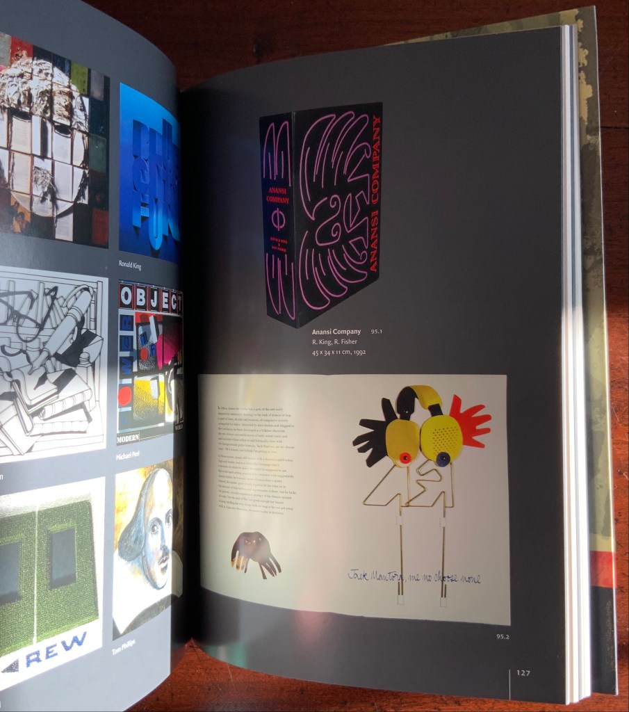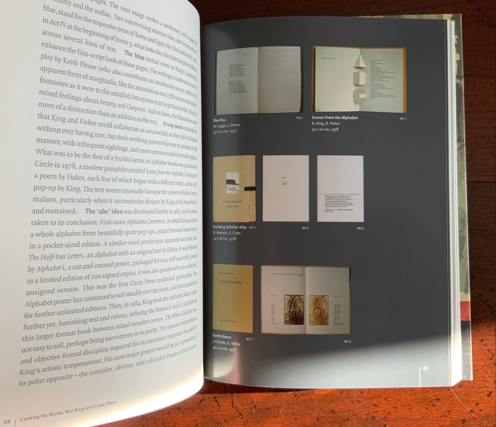 As with Cooking the Books, this catalogue raisonné, prepared by Cathy Courtney, provides samples of the artist’s work. They appear in the wire debossed cover and this centrepiece of “Scenes from the Alphabet” done with Roy Fisher, which led to a full-scale alphabet book at Fisher’s suggestion.