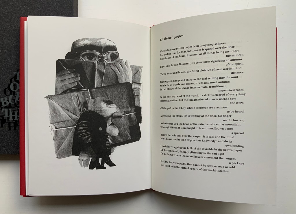 The Burning of the Books(2009) George Szirtes (poems) and Ron King (prints) Slipcase with sewn hardback, duotone letterpress reproduction of the 2008 artist book version. H220 x W160 mm, 66 unnumbered pages. Edition of 1000, the first 100 signed and numbered by the author and artist and presented in a specially designed slipcase. Acquired from the artist, 28 January 2021. Photos of the work: Books On Books Collection.