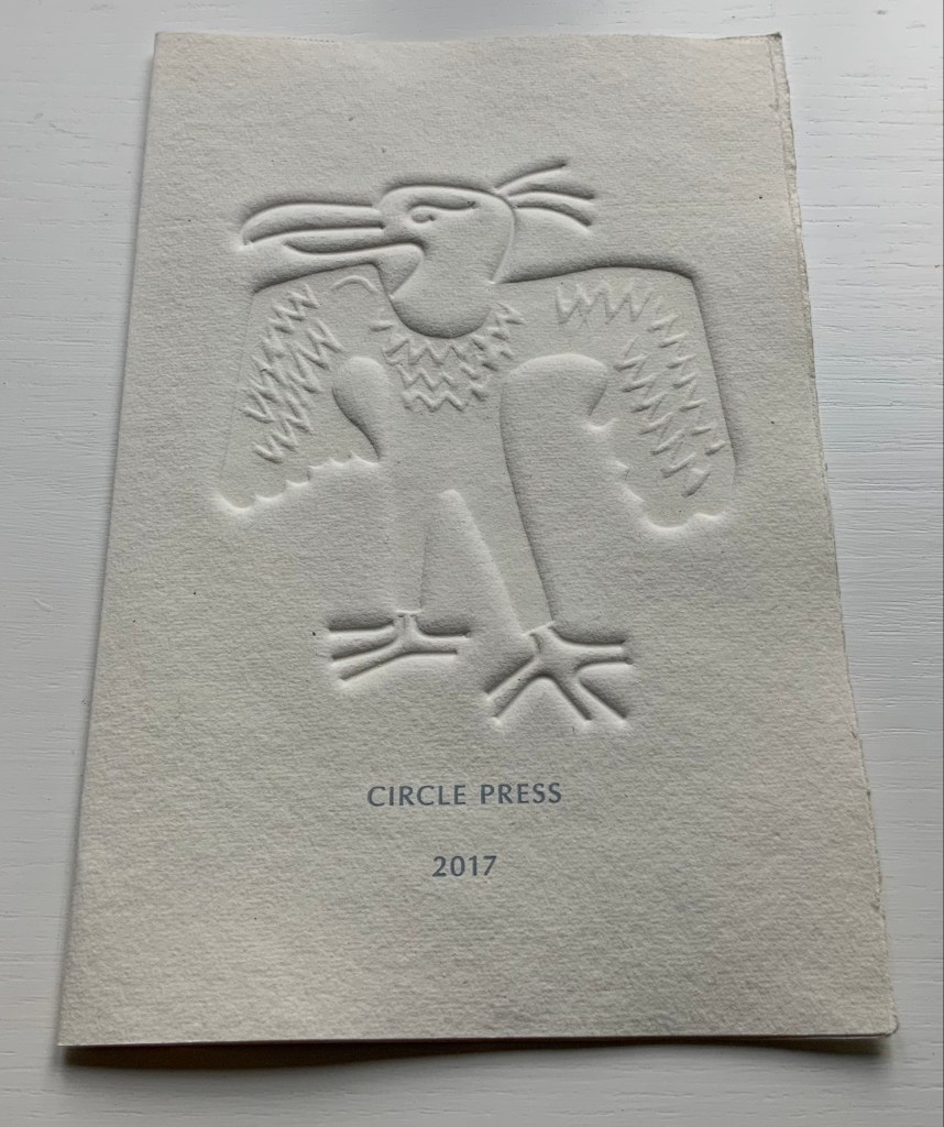 Announcement (single-fold card, H216 x W140 mm) with blind embossed image of a fulmar. Describes artist book Sednar and the Fulmar with Richard Price’s poems. 2017.