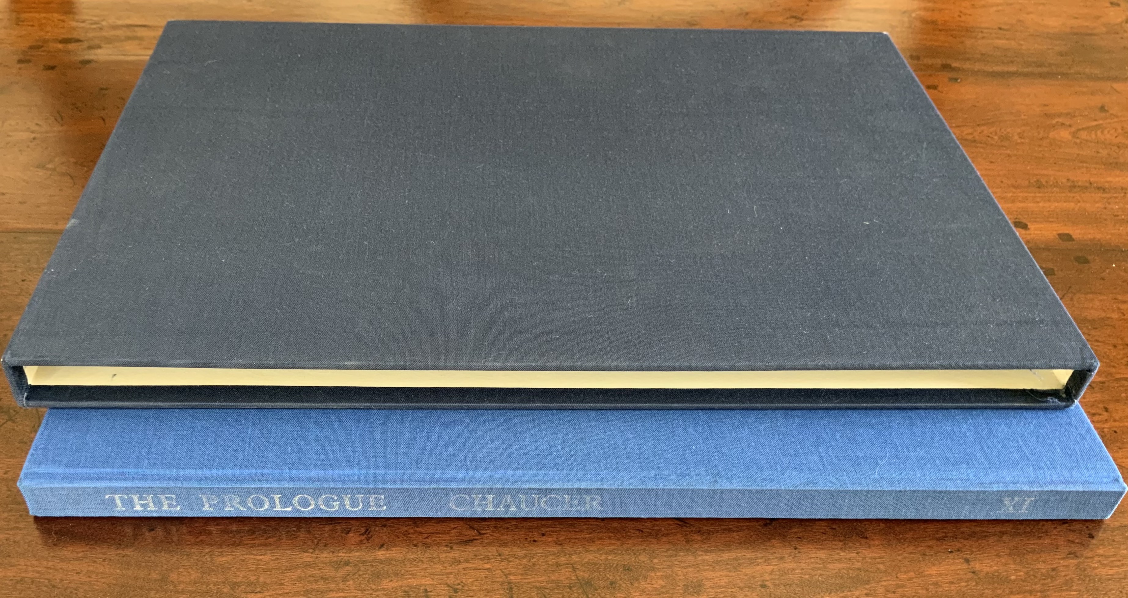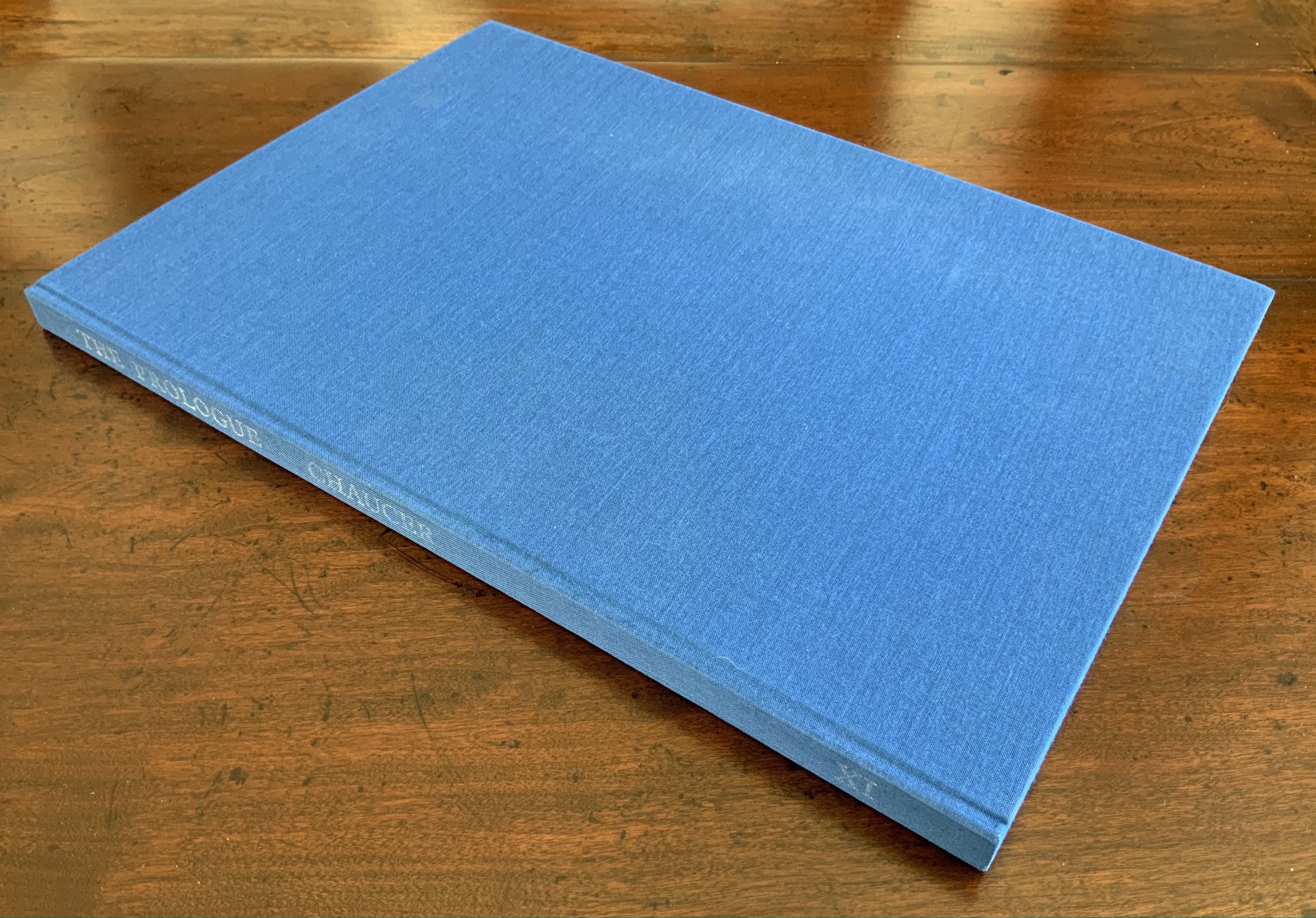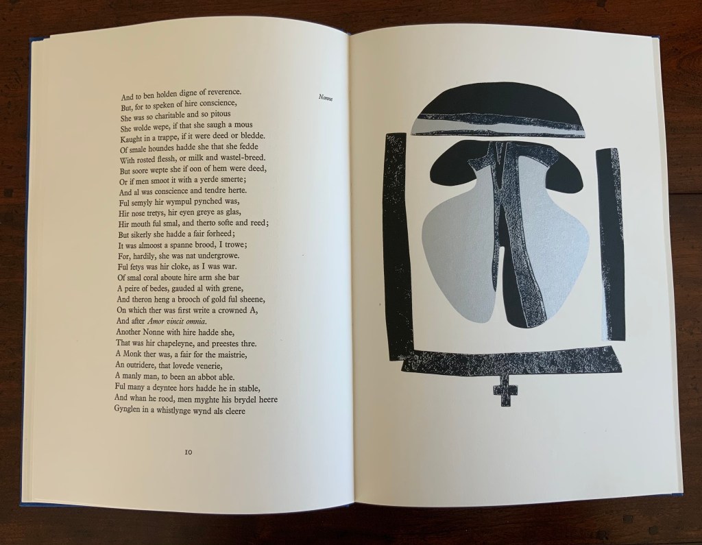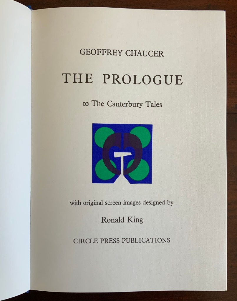 Chaucer’s The Prologue, 2nd Edition (1978) Ron King Casebound sewn, letterpress printed on 190 gsm Queen Anne Antique White. Hand-set in Monotype Plantin series 110. H405 x W281 mm, 72 pages. Edition of twenty separate versions I-XX each of 250 copies, of which this is XI, #131, and includes a folder of Buckler Light Grey Plain with a poem by Roy Fisher and screen-print on 190 gsm Bockingfordby Ron King entitled “Webbe”. Acquired from private seller, 27 February 2021. Photos of work: Books On Books Collection. Displayed with permission of artist.