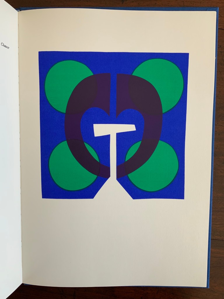 King originally prepared The Prologue for Editions Electo in 1966, then published a limited edition of 125 copies in 1967 under the Circle Press imprint. In this collection, the work represents King’s straightforward fine press work and a successful livre d’artiste. The screenprints of Chaucer’s characters and Chaucer himself are based on African and Brazilian masks as well as heraldic symbols. King’s inspiration to match these richly colored masks to the personae captures the pageantry and individuals within the social hierarchy of Chaucer’s Canterbury Tales. Opening this oversized fine press edition, turning its stiff, creamy pages with their 18 pt Plantin type and confronting these human-sized masks are reminders of the monumentality that this human-scale work of literature has achieved.