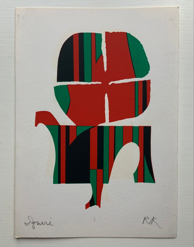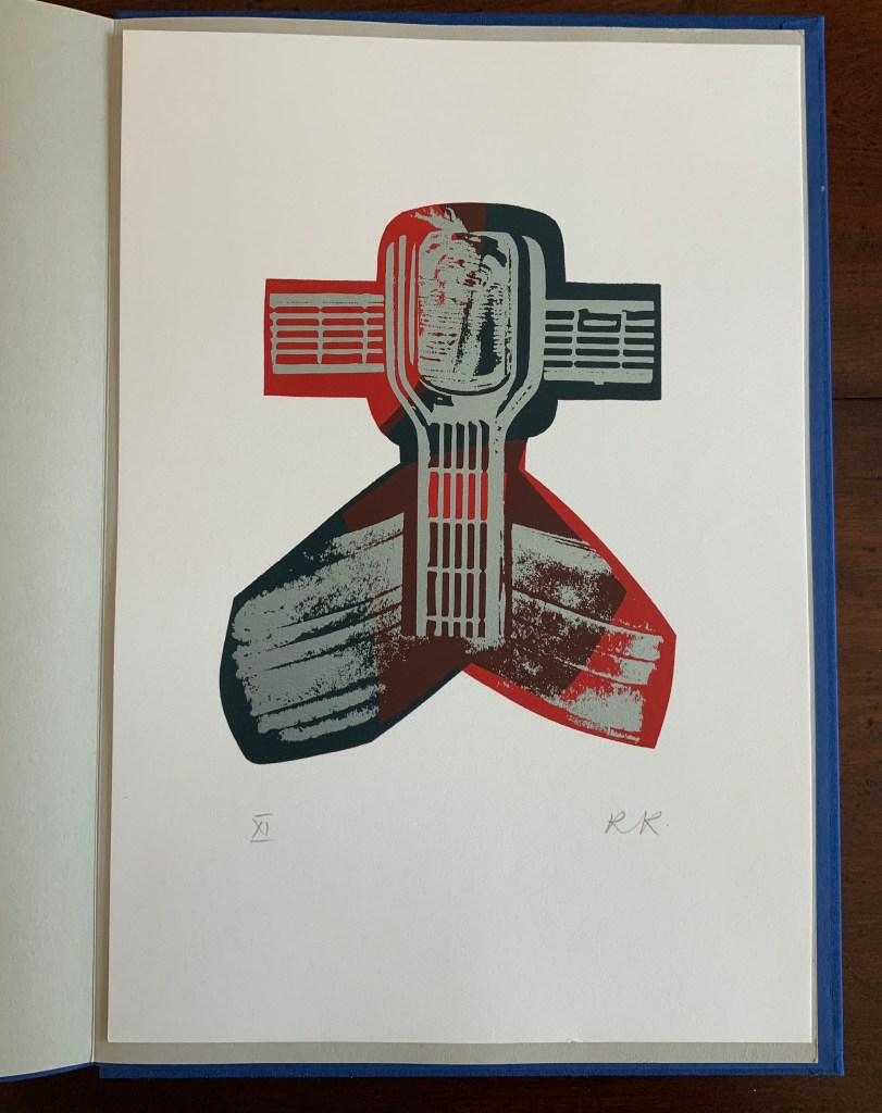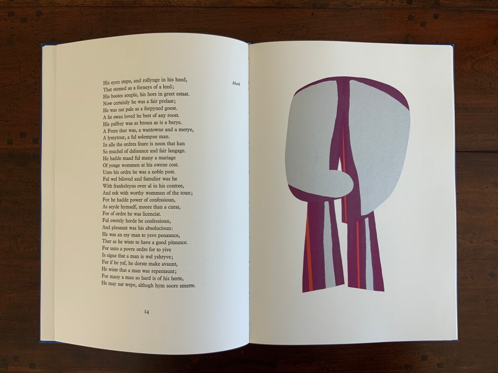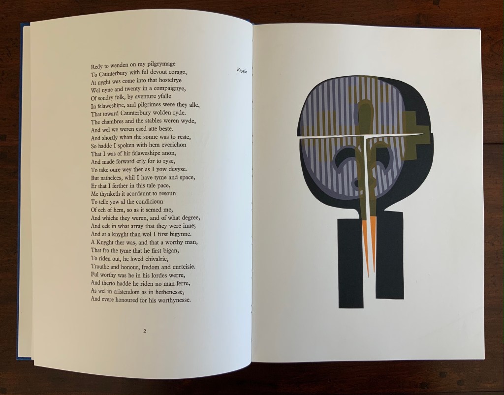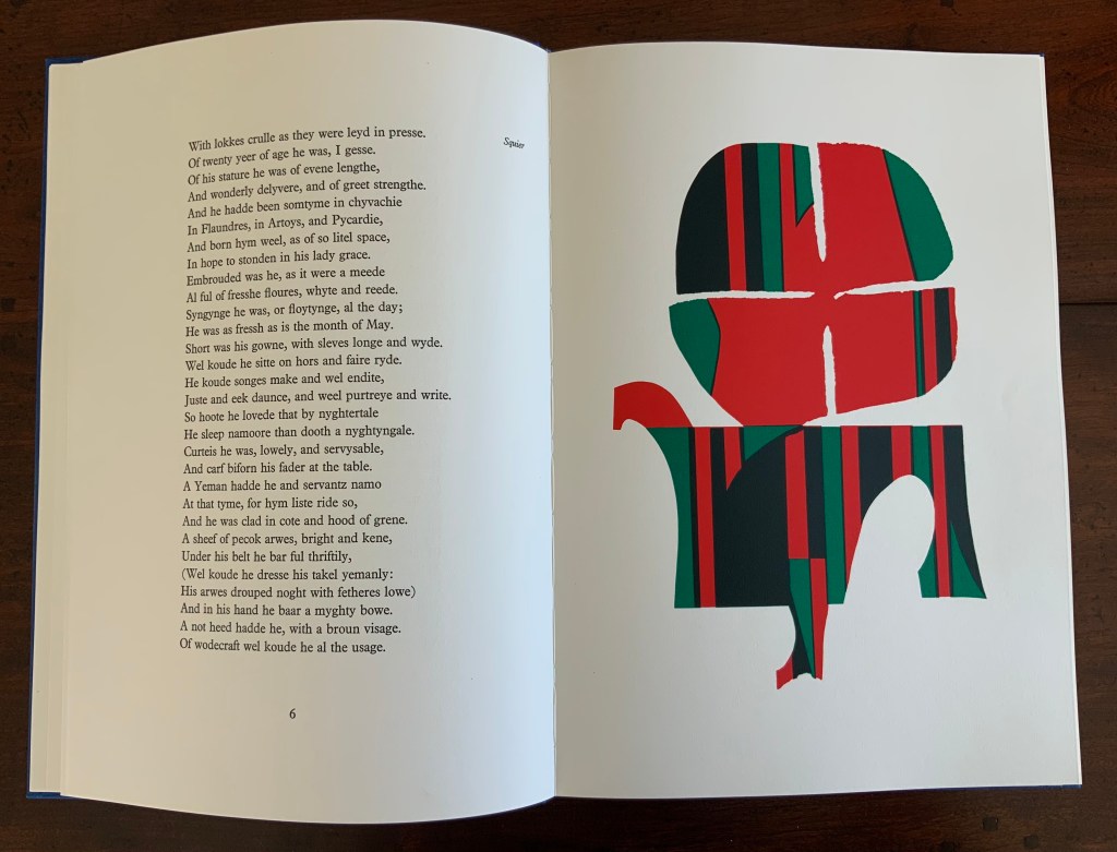 “Squire” (single-fold card, H235 x W165 mm) with hand-printed serigraph from Chaucer’s “Prologue” to The Canterbury Tales. 1969?