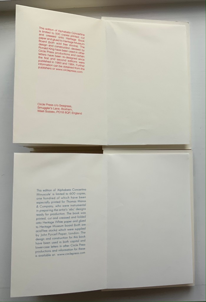 Alphabeta Concertina and alphabeta concertina miniscule (2007) Ron King Printed, cut and creased onto Heritage paper and glued to Heritage Museum board. H170 x W110 x D30 mm,stretching to 3 meters. Edition of 600. Majuscule acquired from the artist, 24 July 2021; miniscule acquired from Sophie Schneideman Rare Books and Prints, 27 November 2020. Photos: Books On Books Collection.