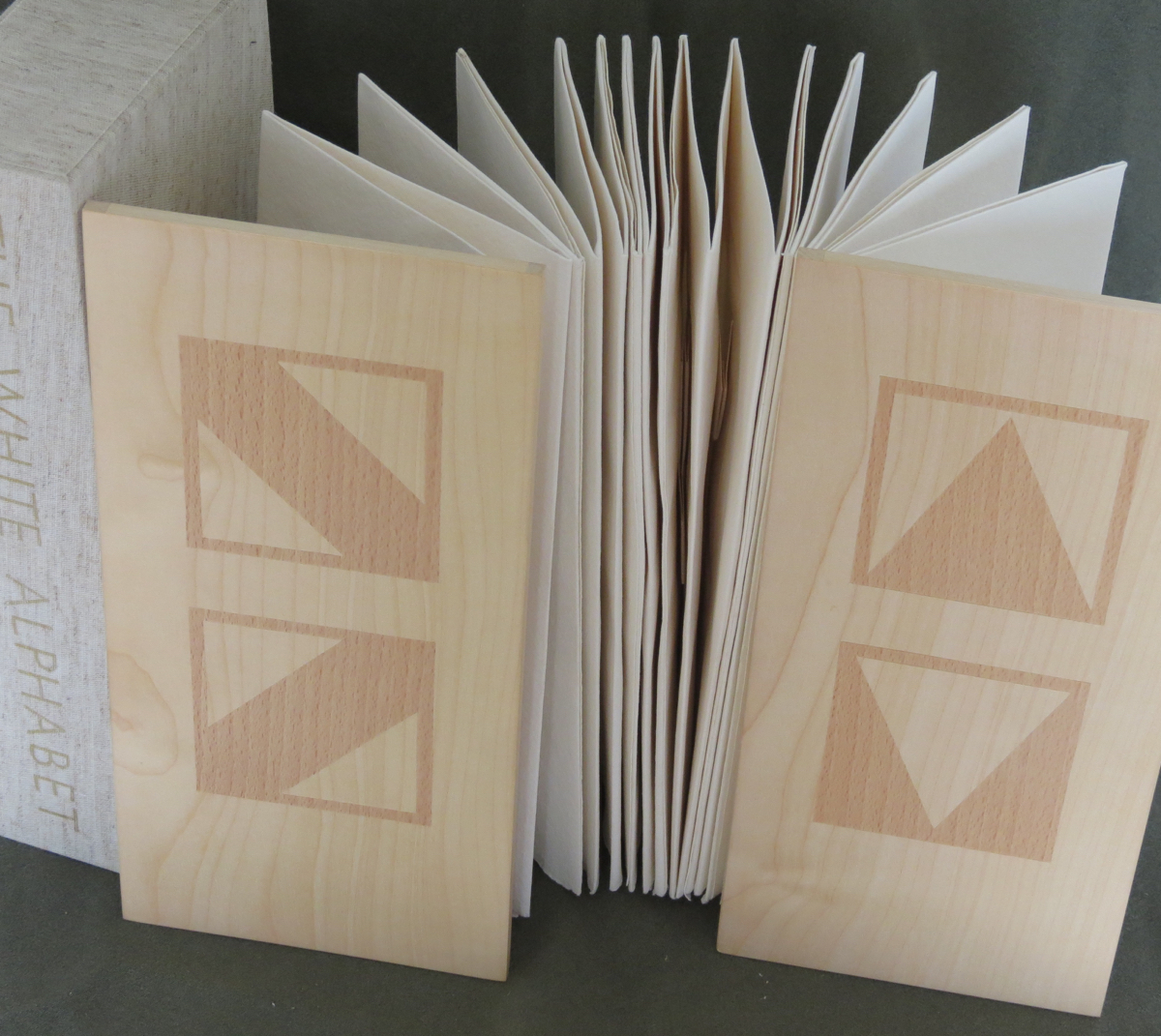 The White Alphabet (1984) Ron King Box made of two slipcases, one inside the other. Gilt lettering on spine of inner slipcase. Back-to-back leporellos with wooden front and back covers. Outer slipcase: H305 x W140 x D70 mm. Leoprello: H290 x W135 mm. Edition of 150, of which this is #99. Acquired from Veatch’s, 11 June 2021. Photos: Books On Books Collection.