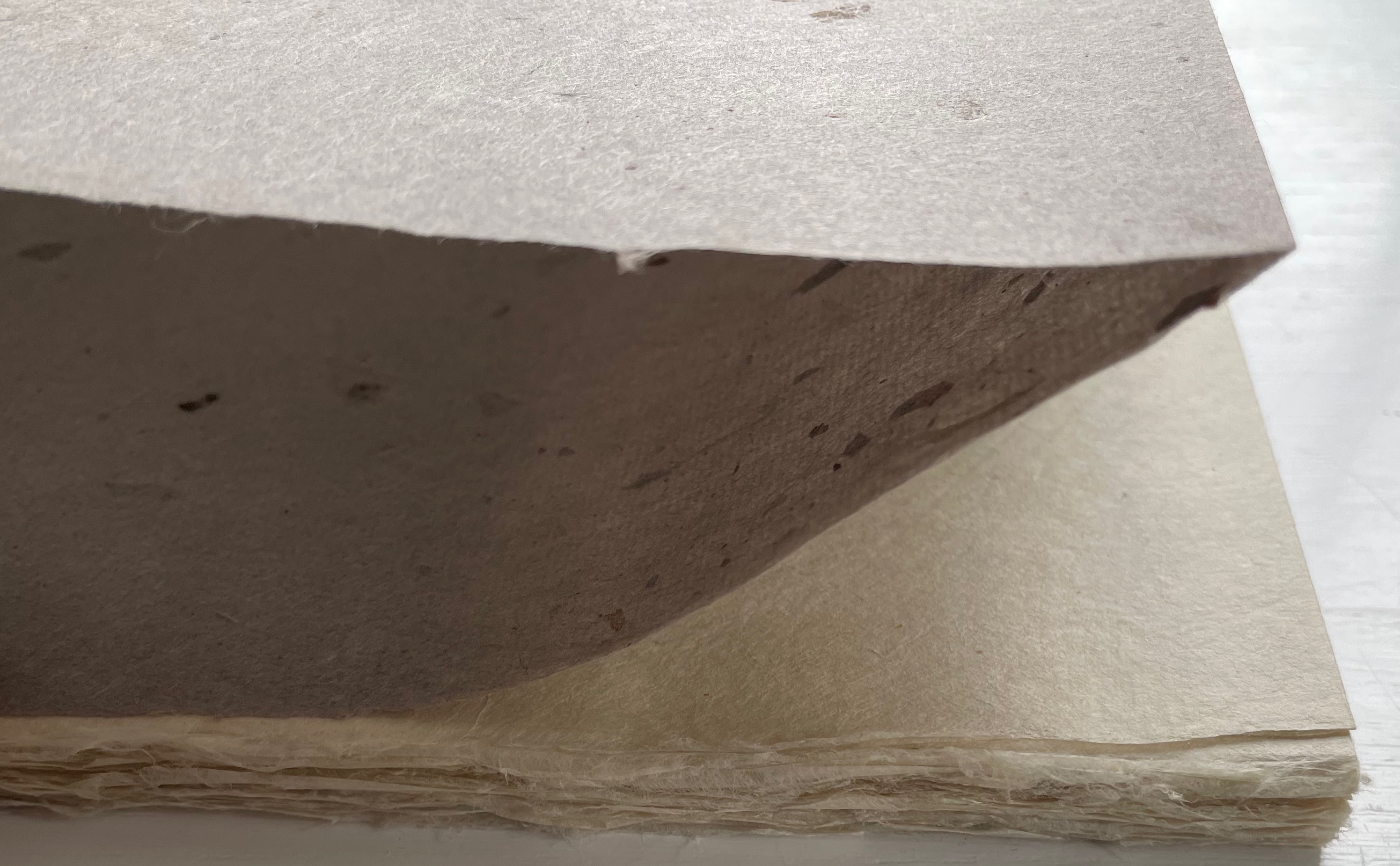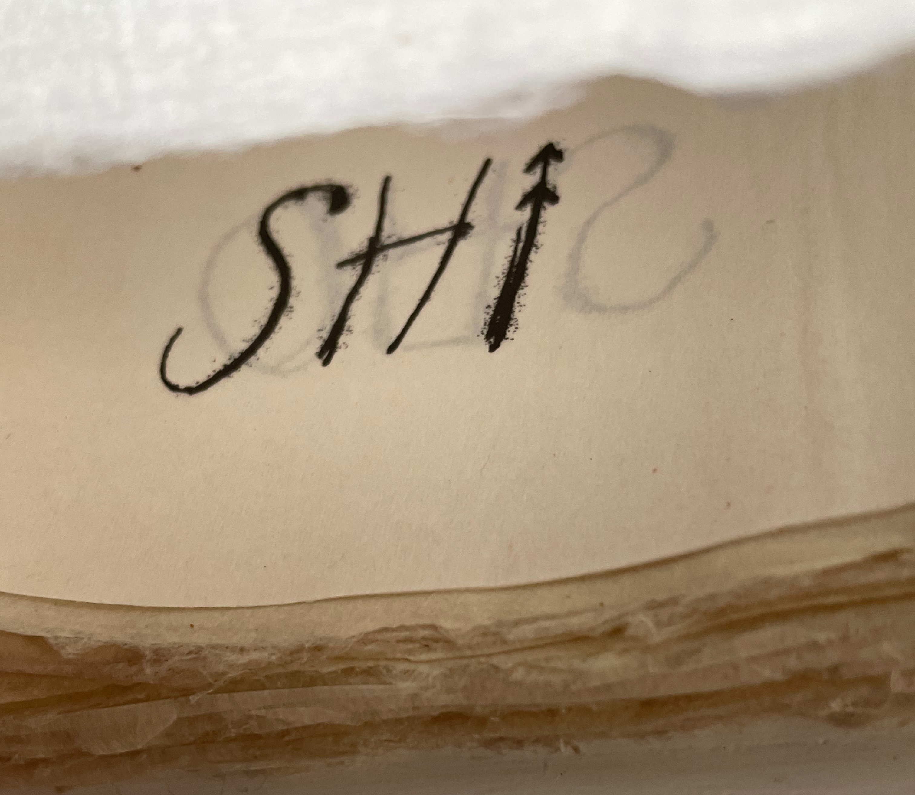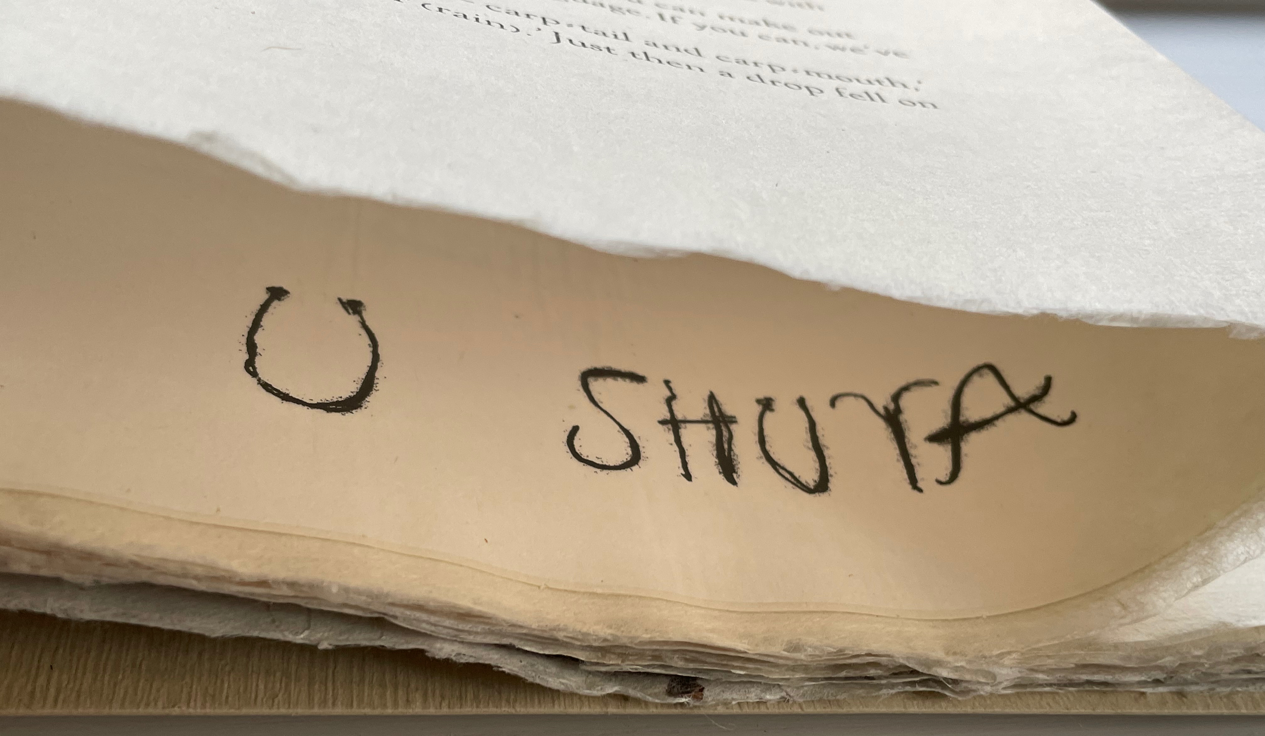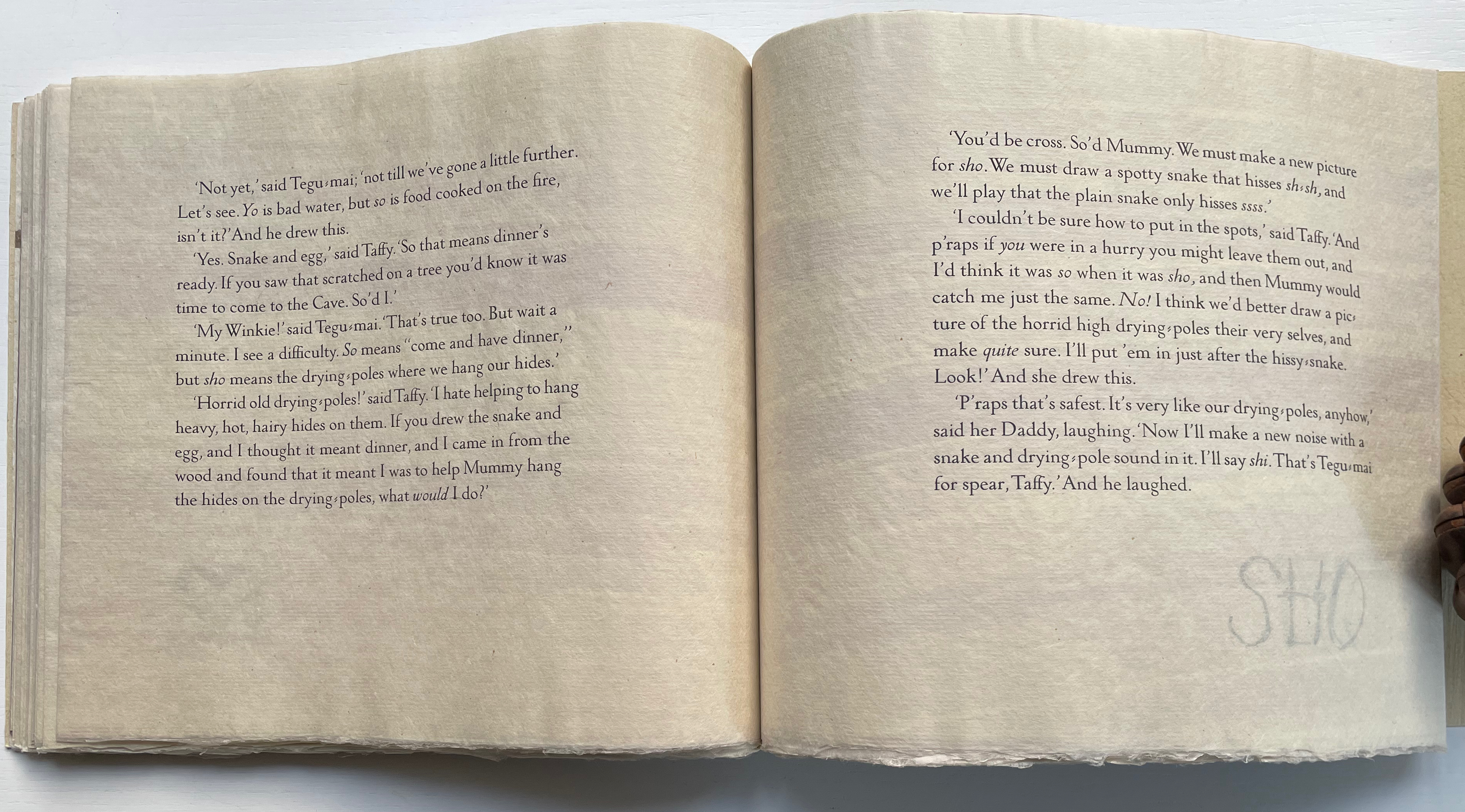 Kipling attributes the drawings throughout to his heroine, Taffi and her father. Where others like Macmillan Children’s Books have rendered them boldly, Lange prints the primitive petroglyph-like images on separate Gampi sheets inserted between the folded Kitakata text leaves of the tortoise shell edge-sewn binding. Those text leaves are individually water colored on their reverse sides (urazaiki manner based on nihonga painting) so that the pictographs beneath reveal themselves through a striated layer. The color and striations are reminiscent of cave paintings. Additional Asian papers (Kasuiri and Chirizome for end sheets, Cogan Grass for covers) increase the work’s tactility — simultaneously soft and rough, flimsy and tough — and contribute a grassy smell redolent of the stories’ physical setting.