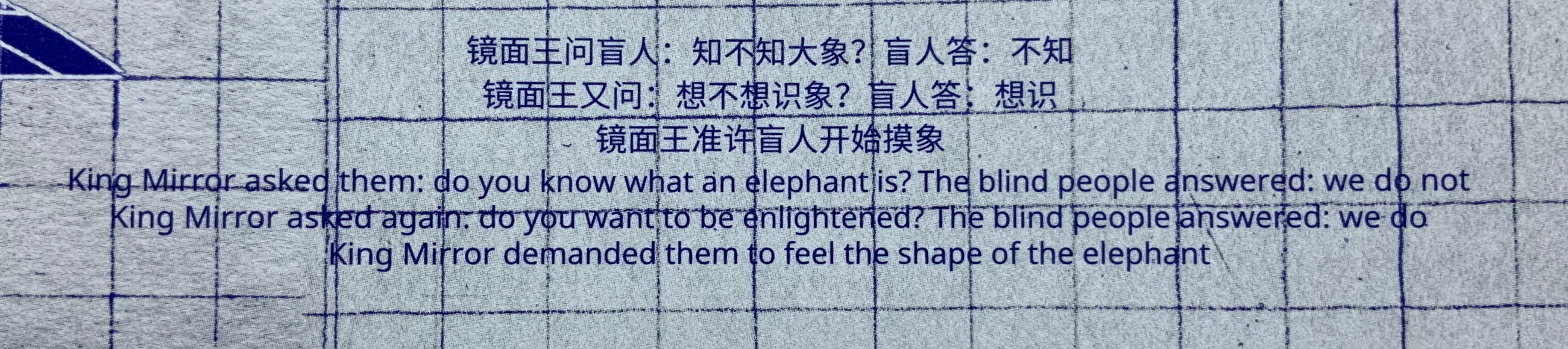 The publishing house Qianxun Neverend has issued a shorter trade edition of The Blind Men and the Elephant. Although a thermochromatic cover proved to be too expensive, an equally interesting design feature animates the cover’s image of the butterfly transforming into the multiple figures in the king’s mind.