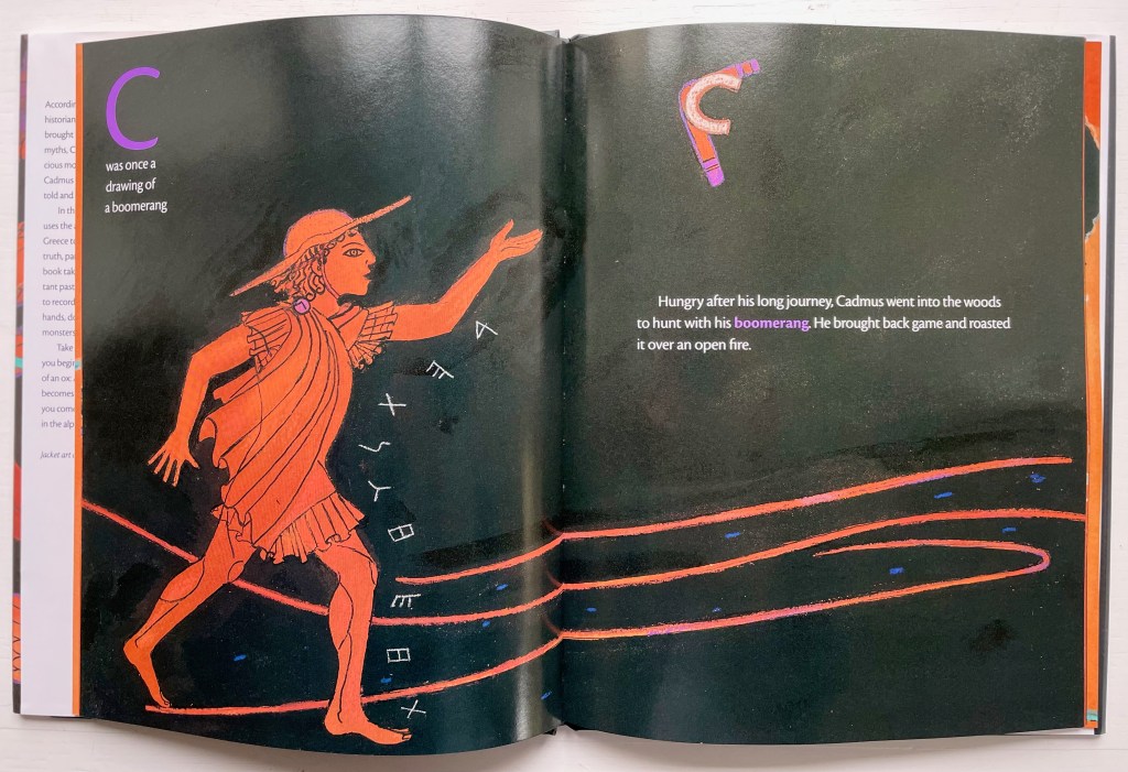 James Rumford subtly weaves fanciful, speculative and well-founded points about the origin and transmission of the alphabet into his inventive reframing of Herodotus’s tale of how the Phoenicians brought the alphabet to Greece. In the double-page spread above, the letter A’s evolution can be found in the ox’s head on the right and among the fish on the left.