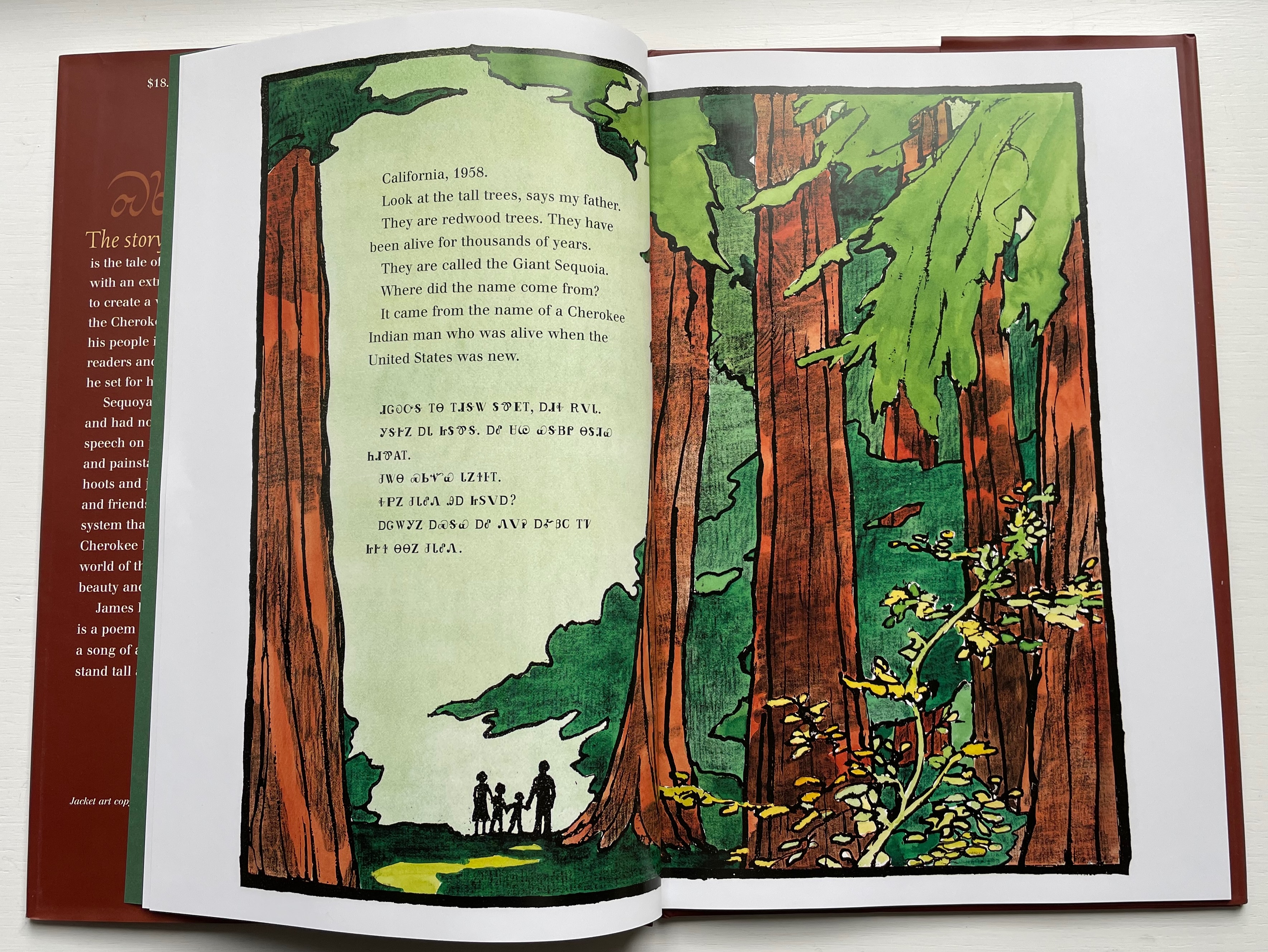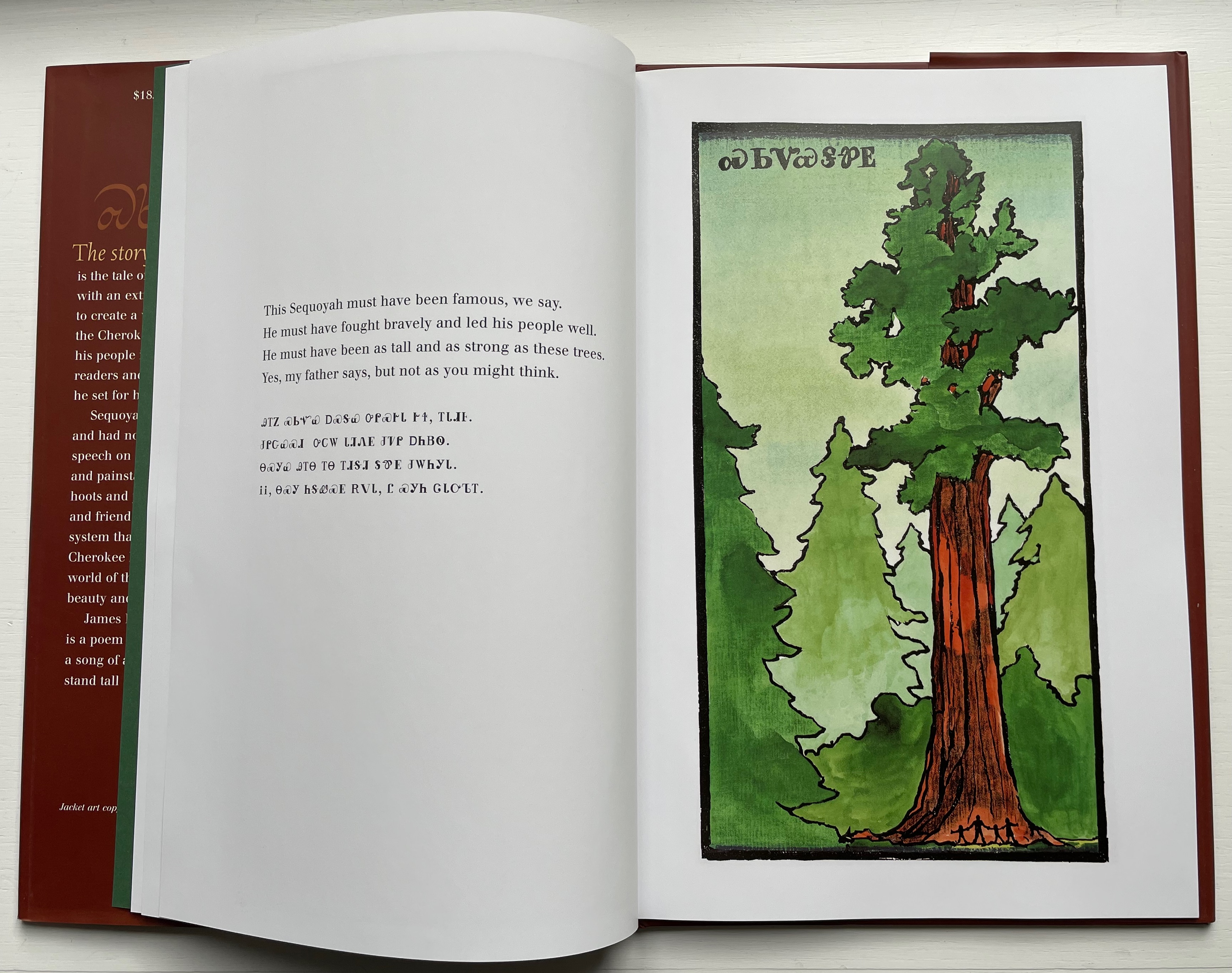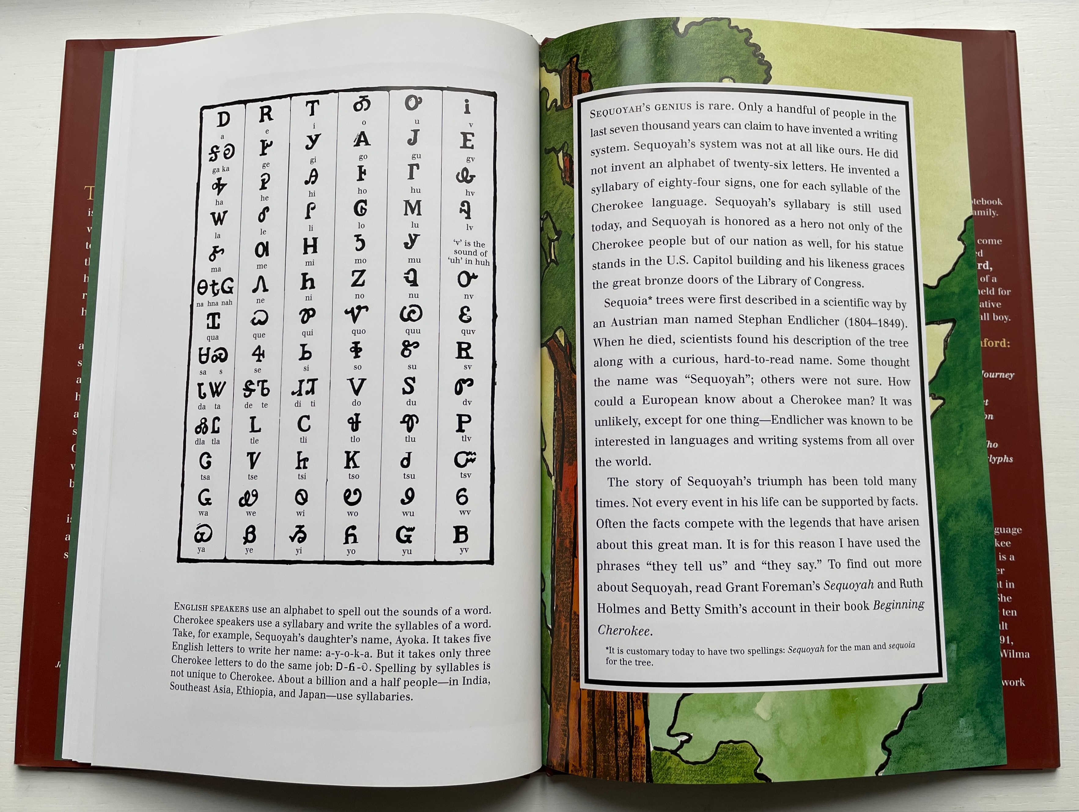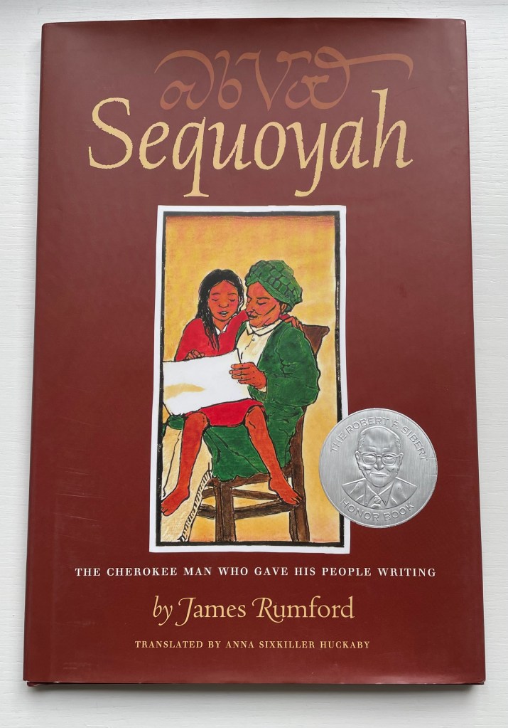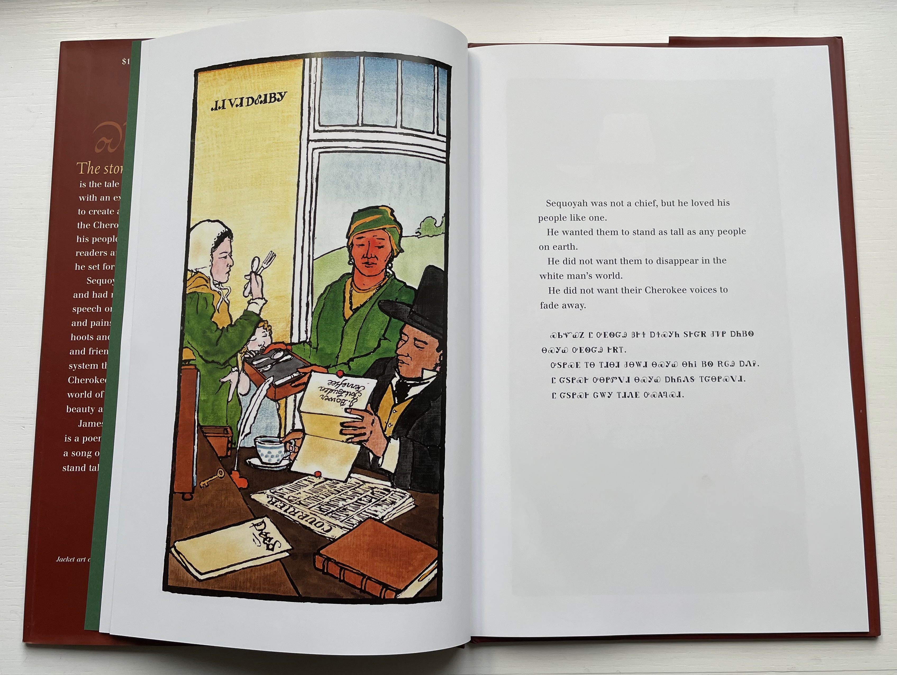 Sequoyah (2004) James Rumford Dustcover, hardback. H285 x W230 mm. 32 pages. Acquired from Amazon EU, 25 September 2022. Photos: Books On Books Collection. Displayed with permission of the author.
