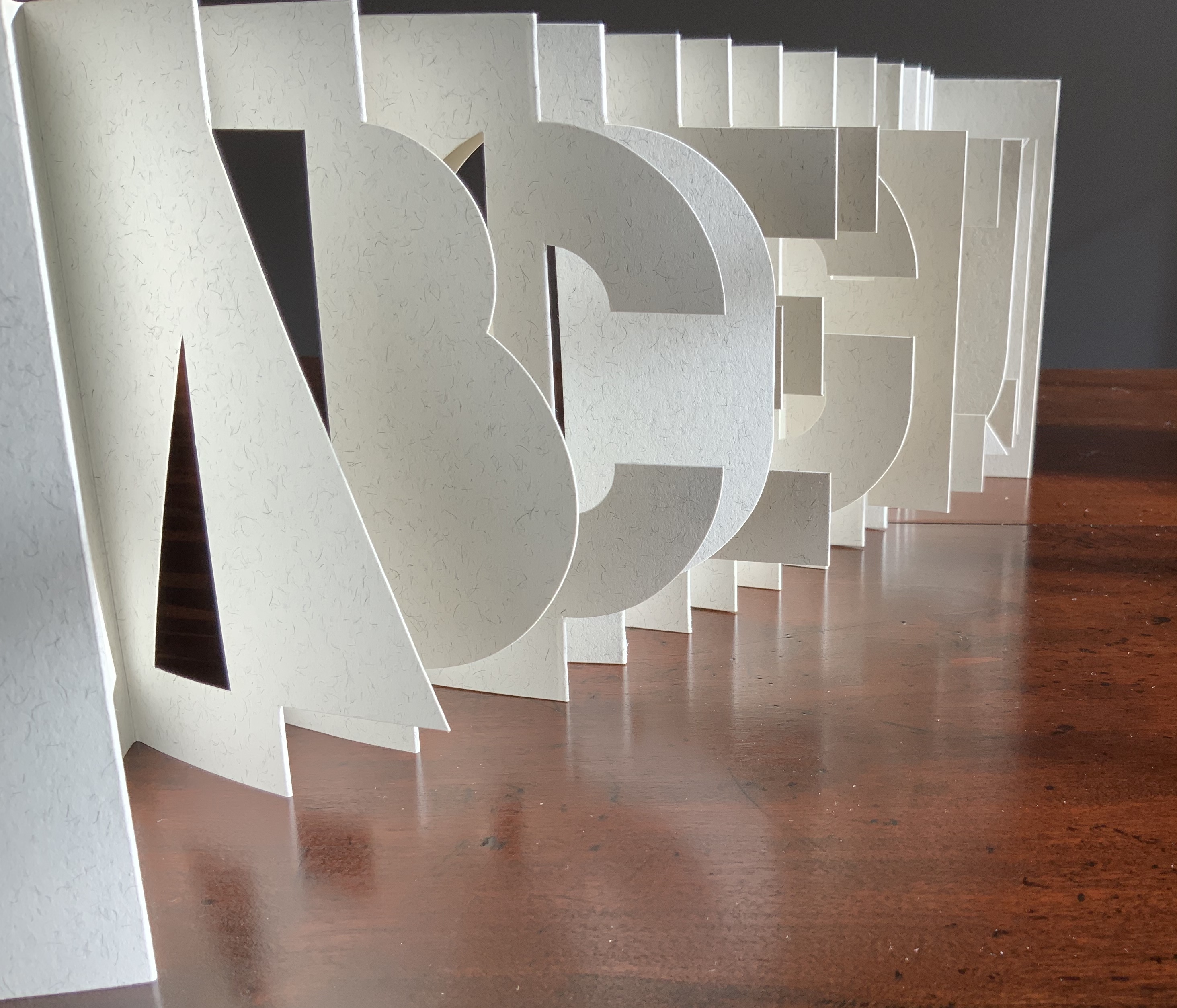 The shape of a letter depends on the “air” — the space — within and around it. Bruno Riboulot’s concept, executed here by Marjon Mudde, demonstrates how those spaces can be formed by cuts, tears, folds, “reveals” and contrasting colors. Truly an abecedary of space. (Thanks to Colin Cohen of Missing Portraits for the reminder of the title’s pun on abécédaire.)