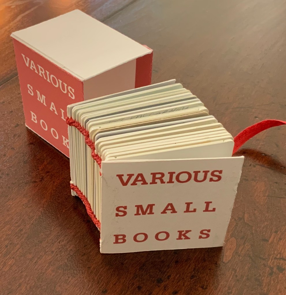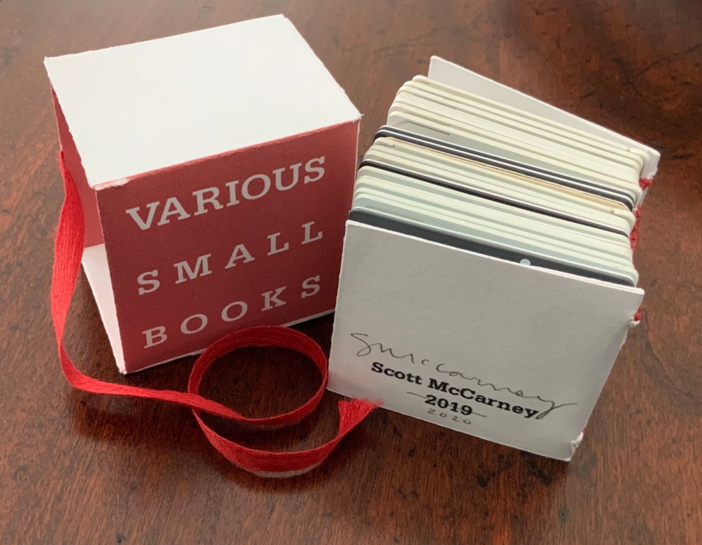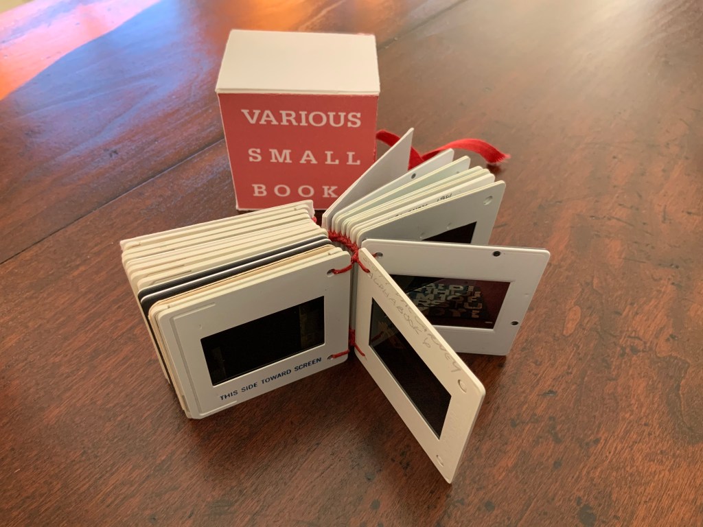 The 2019 edition was conceived for a fundraising exhibition at Artspace in Richmond, VA. Both the 2019 and 2019/20 editions consist of 35mm slides documenting various of McCarney’s bookworks. Consisting of different slides, the two editions of Various Small Books are unique, and since the slides are bound together and cannot be projected, the images of the books appear small indeed.