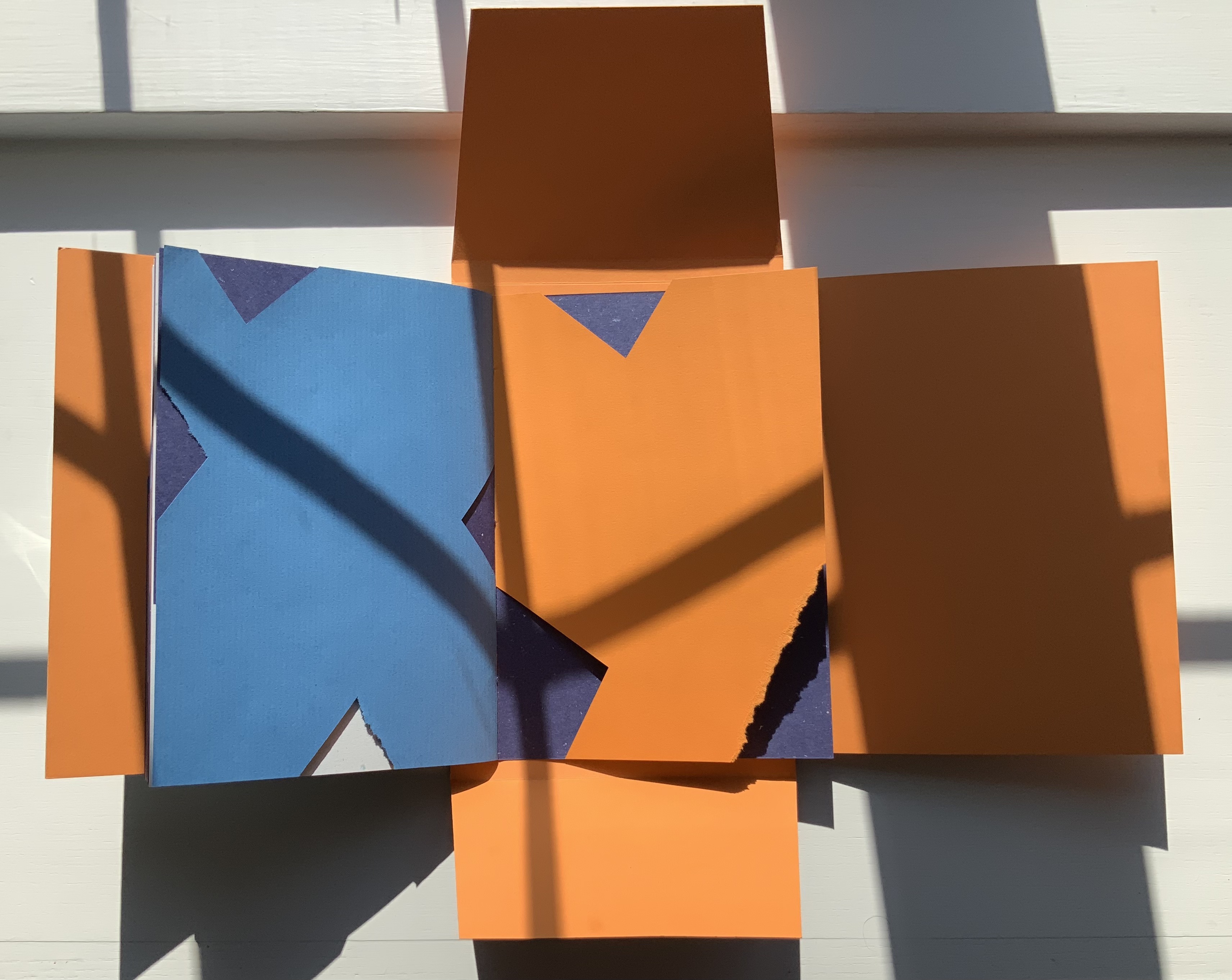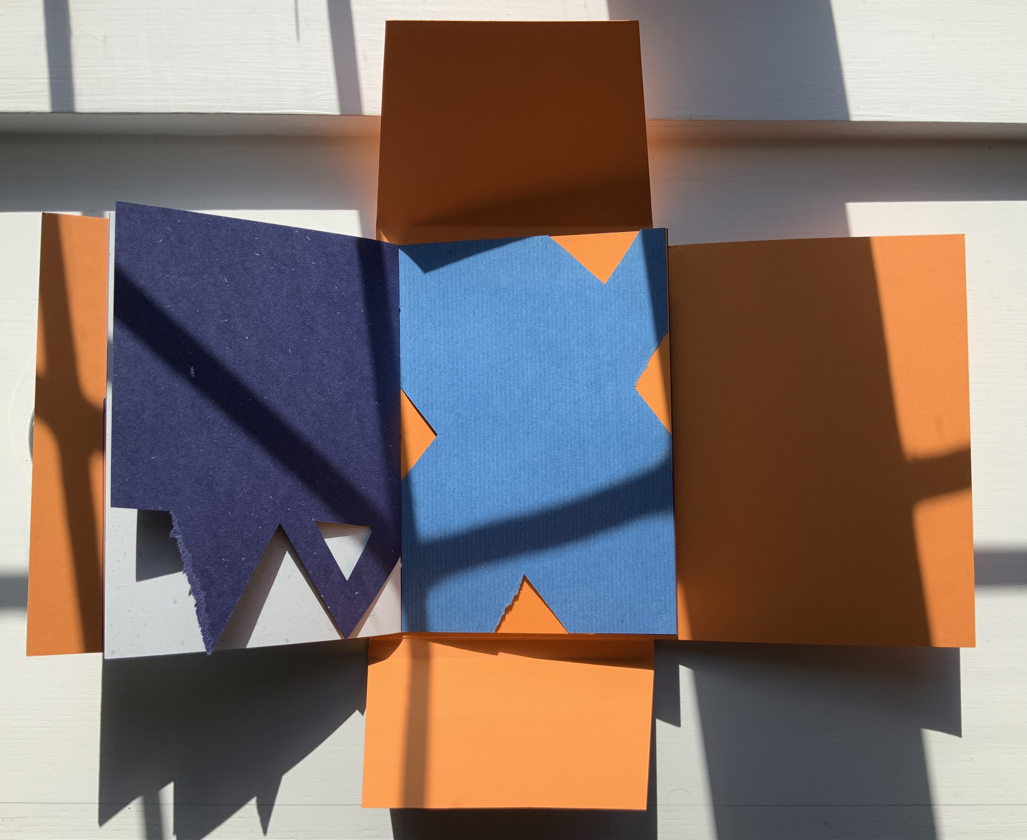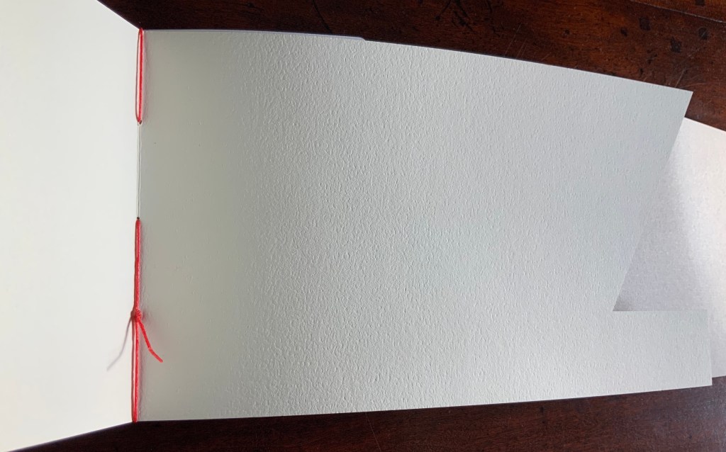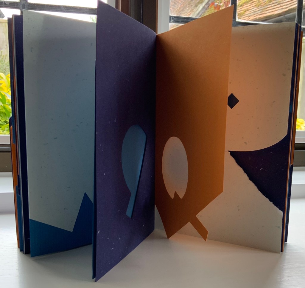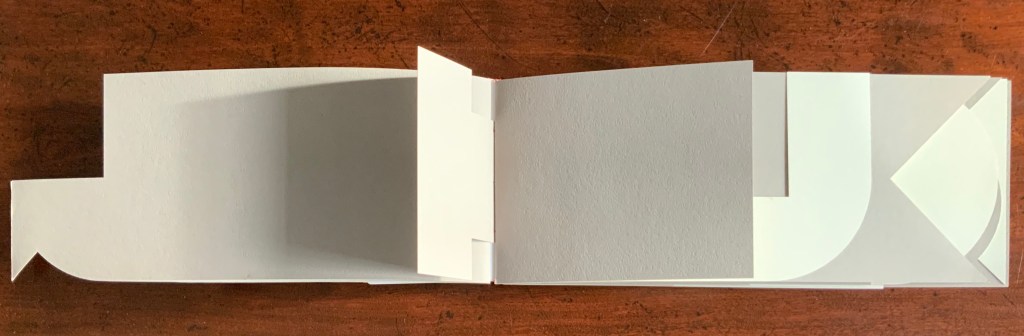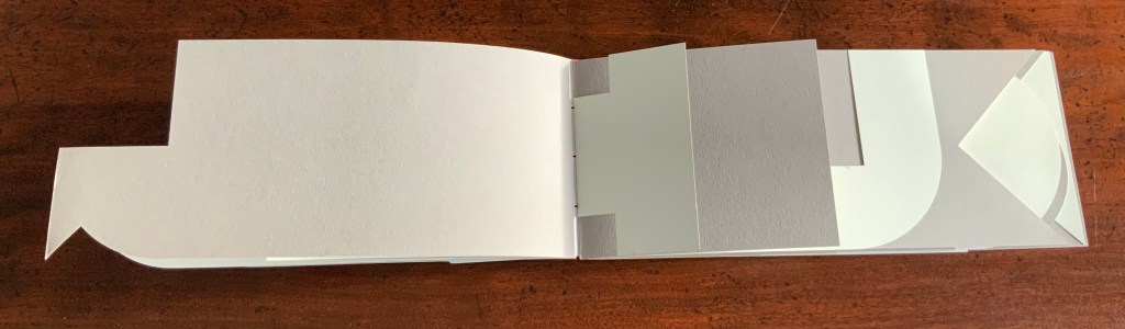 Land Forms and Air Currents (2014) Carol Barton Leporello (with 11 pop-ups) fixed to inside cover of case, cloth over board, debossed with fitted, pastedown artwork on front cover and spine. Cover: H292 x W192 x D50 mm. Leporello: H275 x W175 mm. 37 panels. Edition of 25, of which this is #21. Acquired from the artist, 27 October 2023. Photos: Books On Books Collection. Displayed with artist’s permission.