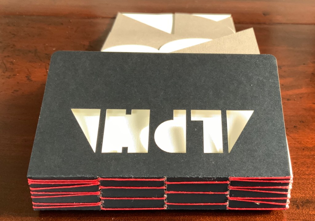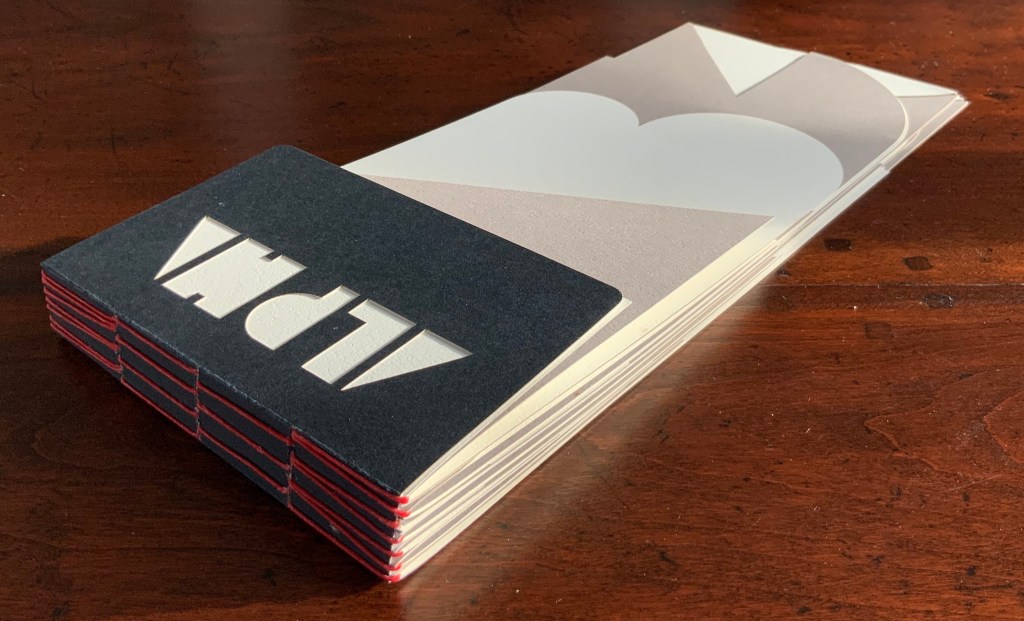 … The fore edge of each page is cut into geometric forms from black, white and cream toned duplex stock (two sheets of different colored paper laminated together). … Produced during a residency at The Institute for Electronic Arts, a high technology research studio facility within the School of Art and Design, NYSCC, Alfred University, New York, committed to developing cultural interactions spurred by technological experimentation and artistic investigations.