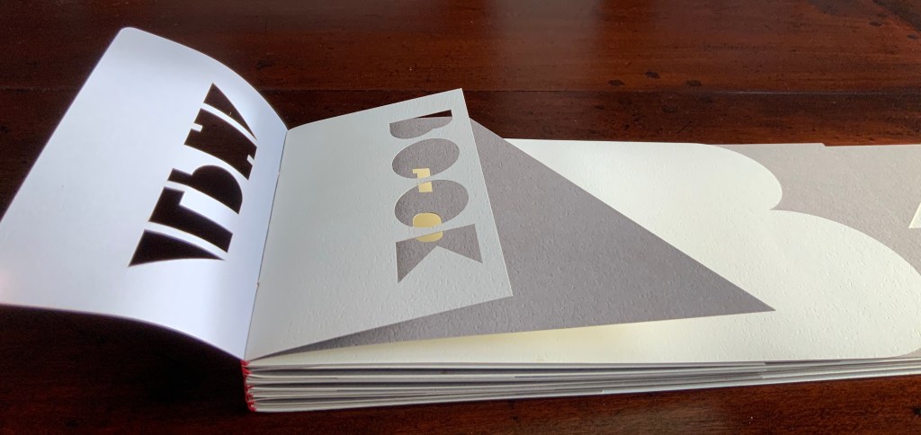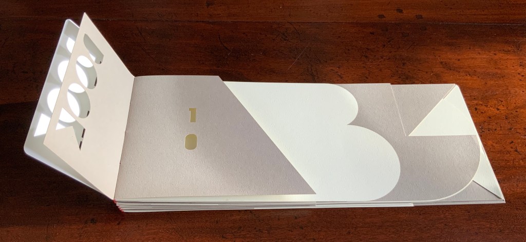 The “reveals” evoke the harlequinade (“flap-book”, “turn-up”, “metamorphosis” or “lift-the-flap”) structure invented in 17th century, in which the book’s narrative unfolds as each flap is lifted. To appreciate how differently this structure can be used with the alphabet, compare it with Scott McCarney’s Alphabook 10 (2015) and Thomas Ockerse’s The A-Z Book (1969/2014).
