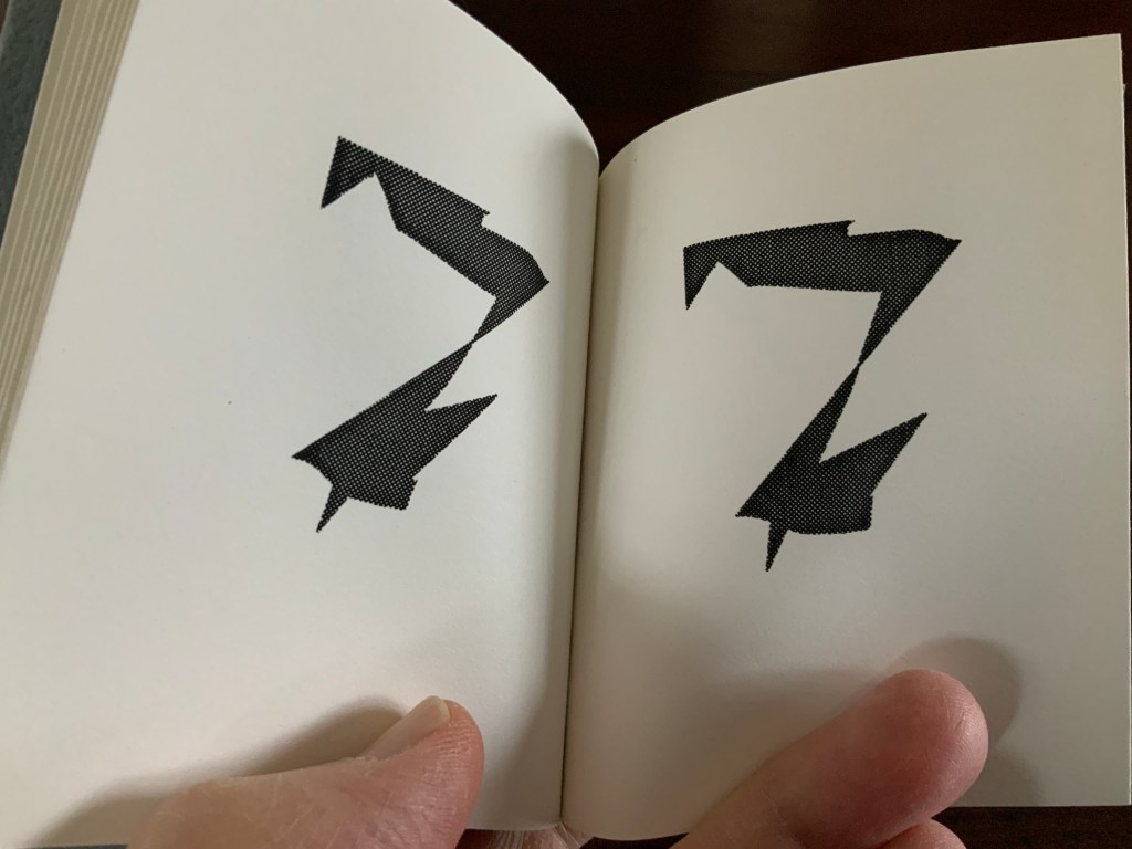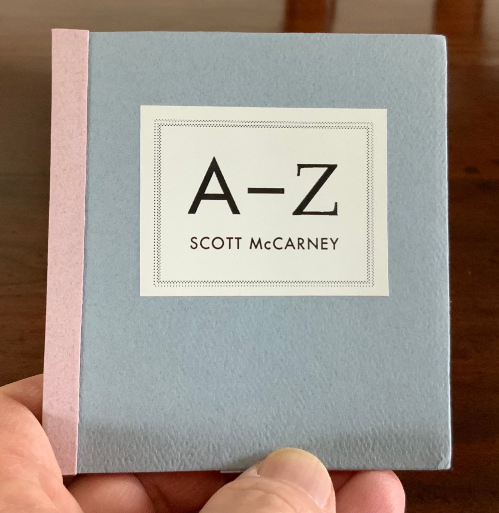 In correspondence with Books On Books, McCarney explains that the Alphabooks’ mismatch of numbering and chronology stems from discrepancies between dates of conception and opportunities to execute. This little flipbook was conceived and executed as a photocopy edition of 25 in 1991; of more importance here though is the coming together of computer-based typesetting, book structure and pun. As we know, the shortest distance between A and Z is not B to Y, but the points in A reconfigured into Z across 24 flipping pages. It is interesting to compare this transformation with Claude Closky’s calligraphic version De A à Z (1991).