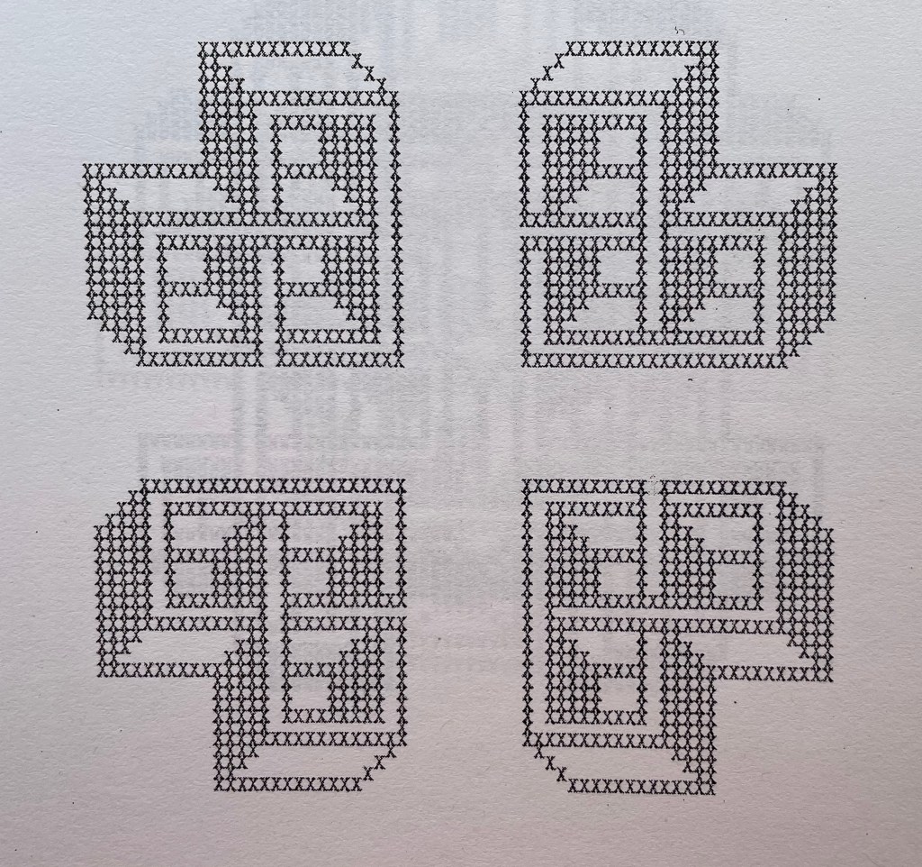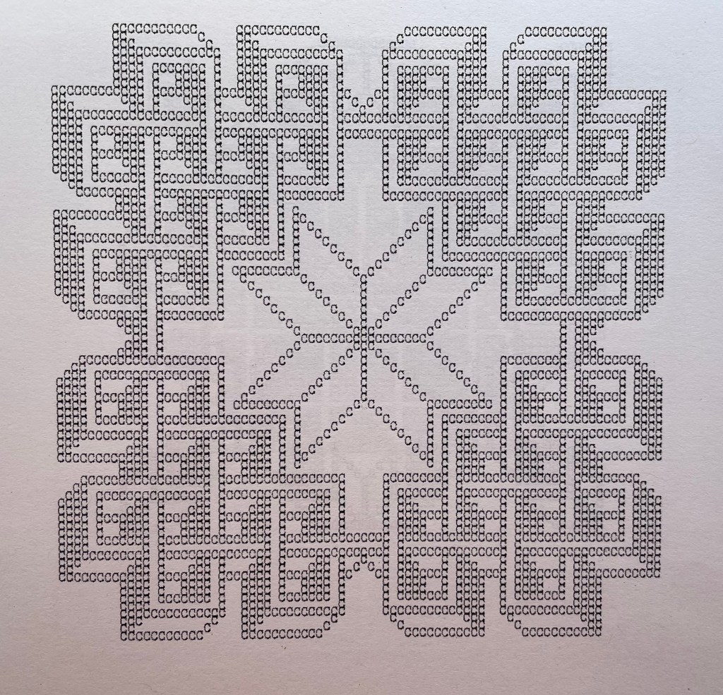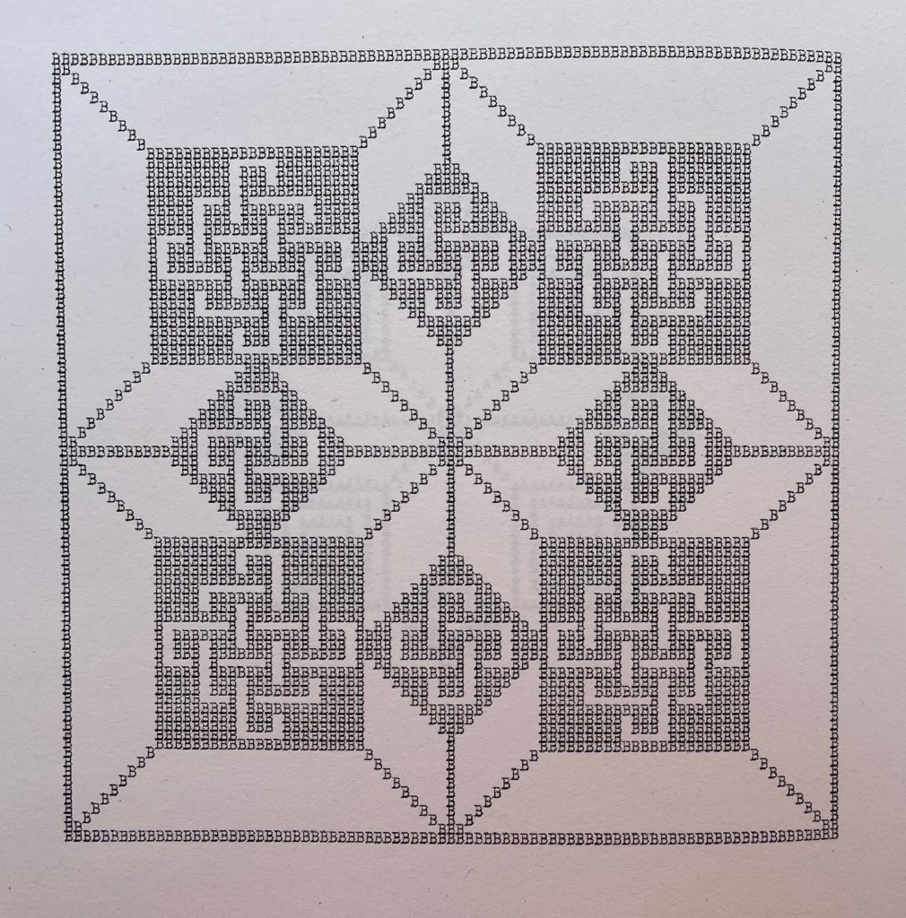 The series of patterns, each made from an upper case letter of the alphabet typed over and over, range in appearance — some like Amish quilts, some like Byzantine rugs, some like Celtic knots, but like snowflakes, no two alike. Given how some pairs of letters are mirror images of each other (bd, pq) or inverse (bp, dq), you would expect some close affinity in their two patterns, but no. No pairs of those patterns look at all alike. You would also be mistaken to expect a pattern to reflect the letter that constitutes it. Instead, you find one pattern resembling the letter X, but it is made of letter U’s. There are naturally some similarities between patterns at the broadest level — E and N, L and M or R and S — but these have little to do with the letters themselves, and the similarity recedes as details come to the fore or falls into the background with illusory three dimensionality. The shapes are not rune like, but individually and sequentially, they have the associative dream-like qualities of runes.