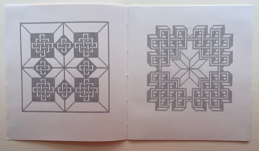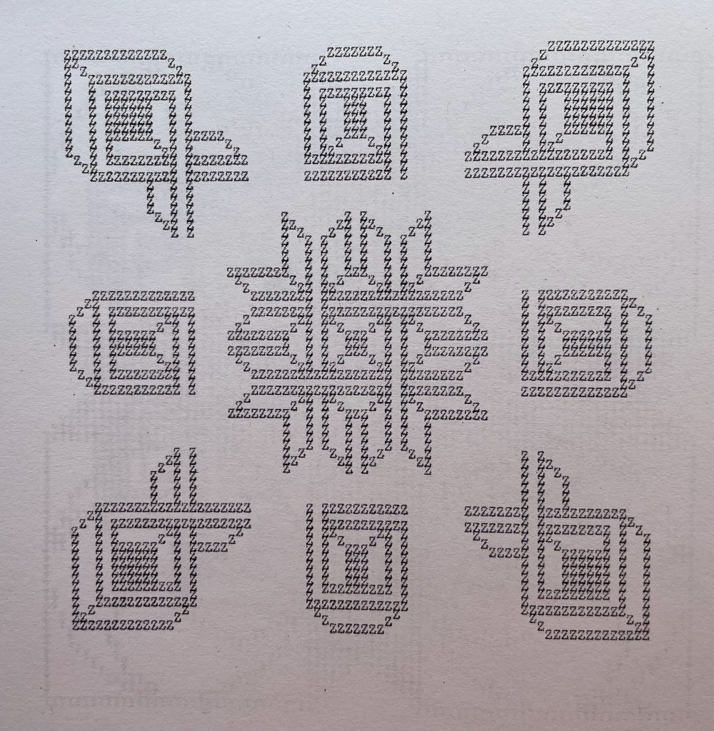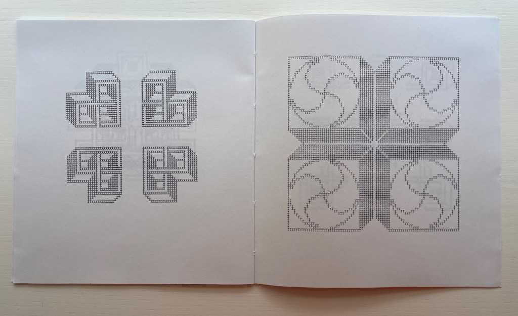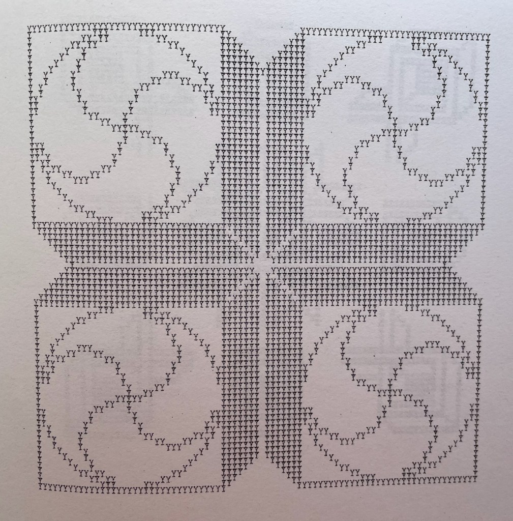 The series of patterns, each made from an upper case letter of the alphabet typed over and over, range in appearance — some like Amish quilts, some like Byzantine rugs, some like Celtic knots, but like snowflakes, no two alike. Given how some pairs of letters are mirror images of each other (bd, pq) or inverse (bp, dq), you would expect some close affinity in their two patterns, but no. No pairs of those patterns look at all alike. You would also be mistaken to expect a pattern to reflect the letter that constitutes it. Instead, you find one pattern resembling the letter X, but it is made of letter U’s. There are naturally some similarities between patterns at the broadest level — E and N, L and M or R and S — but these have little to do with the letters themselves, and the similarity recedes as details come to the fore or falls into the background with illusory three dimensionality. The shapes are not rune like, but individually and sequentially, they have the associative dream-like qualities of runes.