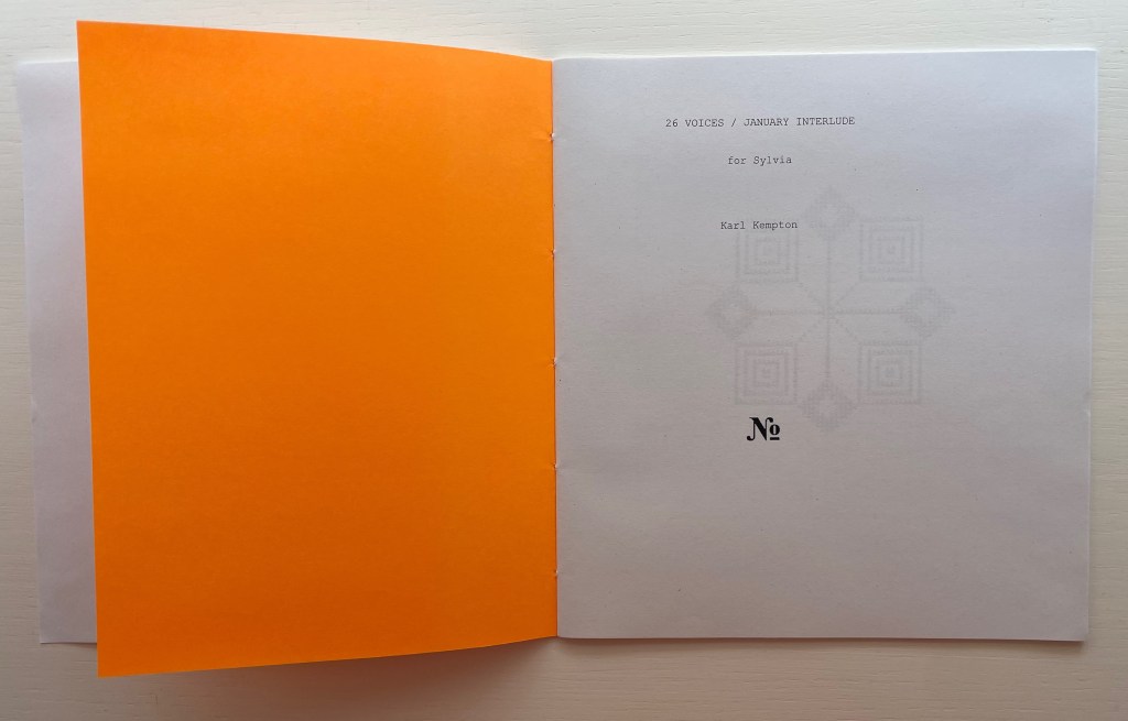 26 Voices / January Interlude (2020) Karl Kempton Sewn booklet. H190 x W177 mm. 28 pages. Edition of 60 unnumbered. Acquired from Derek Beaulieu, 4 January 2021. Photos of the work: Books On Books Collection. Displayed with permission of the artist.