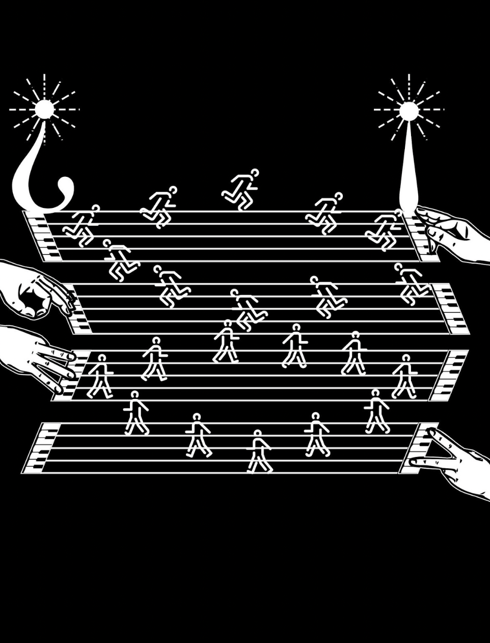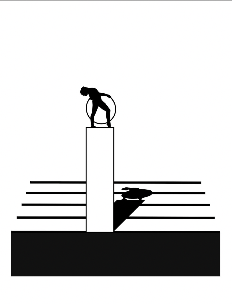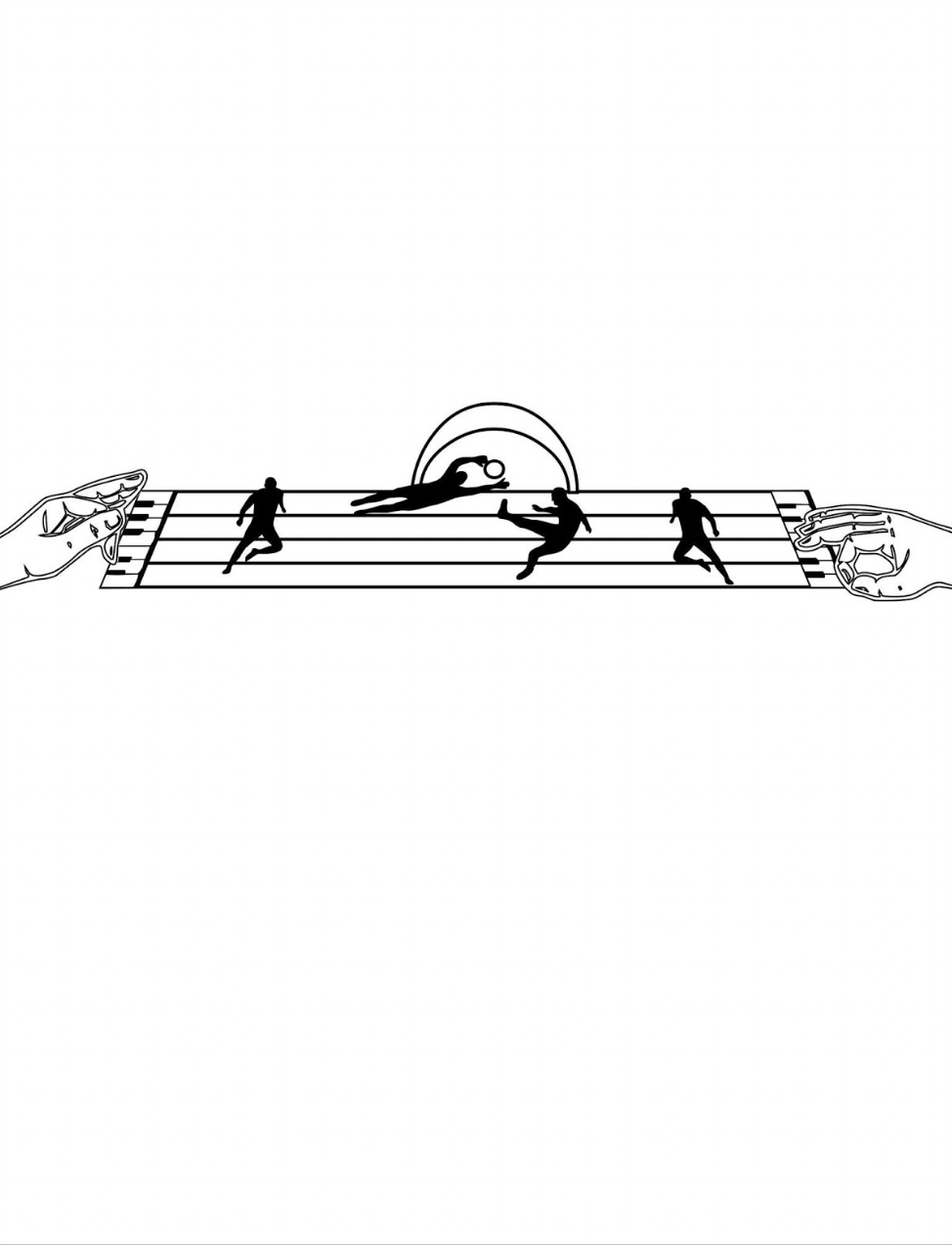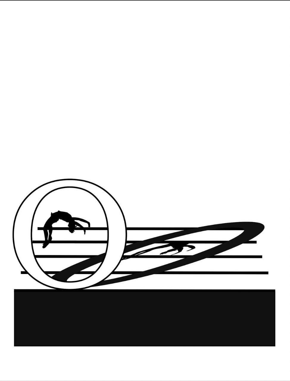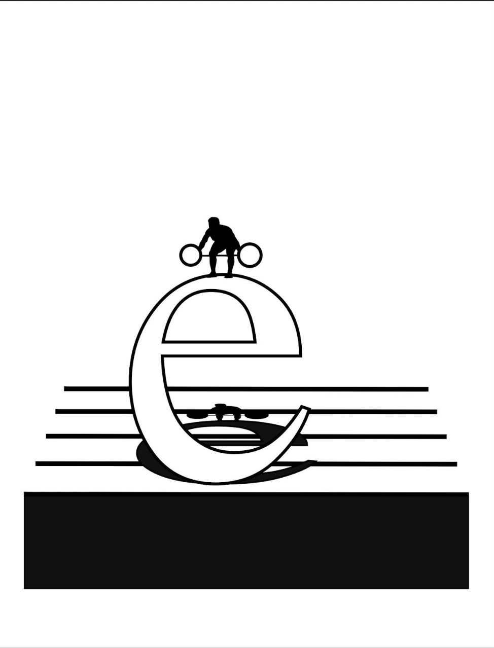 The images become more worked as the book proceeds. A weightlifter atop a lowercase e lifts a set of weights composed of the umlaut above the e, and the shadow of the image is cast across the stave lines behind the letter. Shadows of gymnasts appear behind an uppercase G, lowercase o and lowercase i.