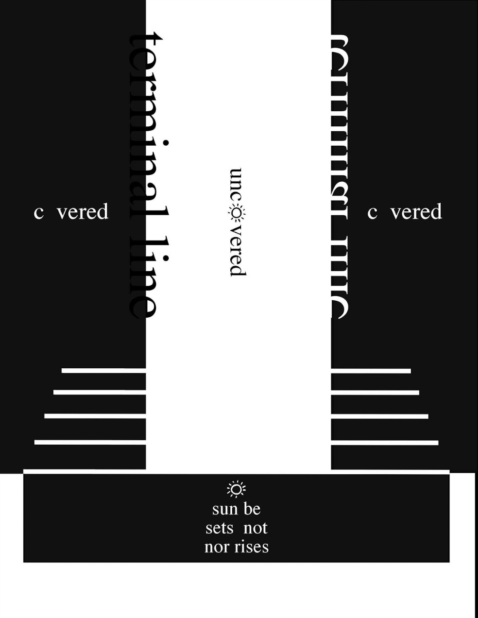 From here on, additional motifs are developed, and words and phrases appear: a physics experiment punningly labeled “period piece”, a night game lit by inverted question and exclamation marks, and juxtaposed opposites (“covered/uncovered” and “sunrise/sunset”).