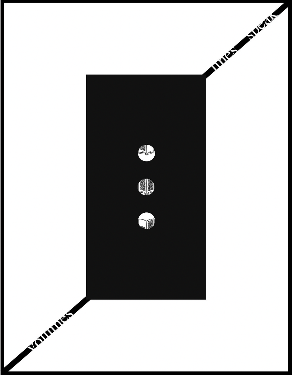All these motifs, textual and visual puns, and images seem concerned with the development of symbols for interpreting the world and communicating that interpretation. With the appearance on black background of an exclamation mark with an open book inside its point, then a pair of rectangles each suspended by the sentence “volumes lines speak / lines speak volumes”, an animated sequence begins an extended narrative drawing everything together.