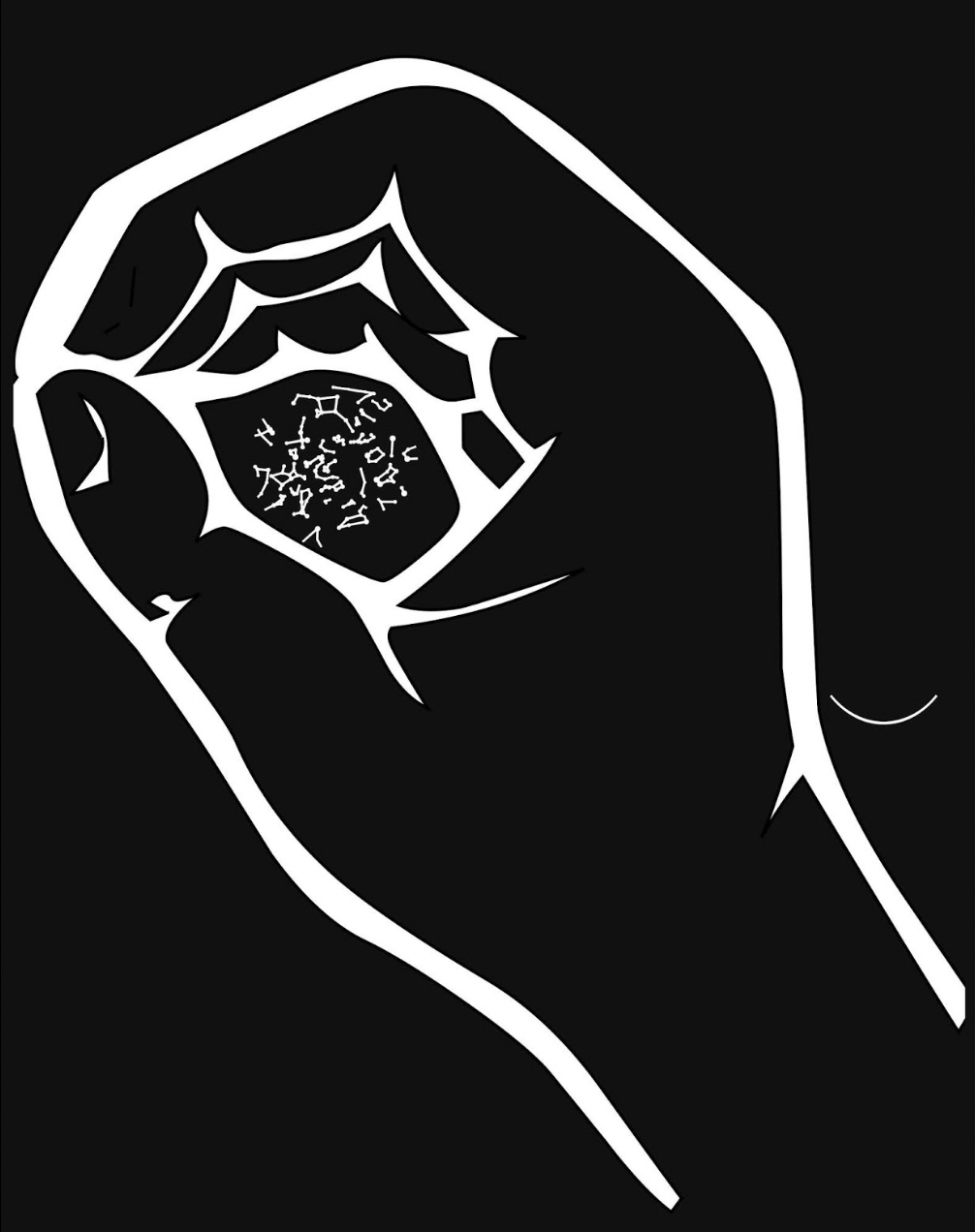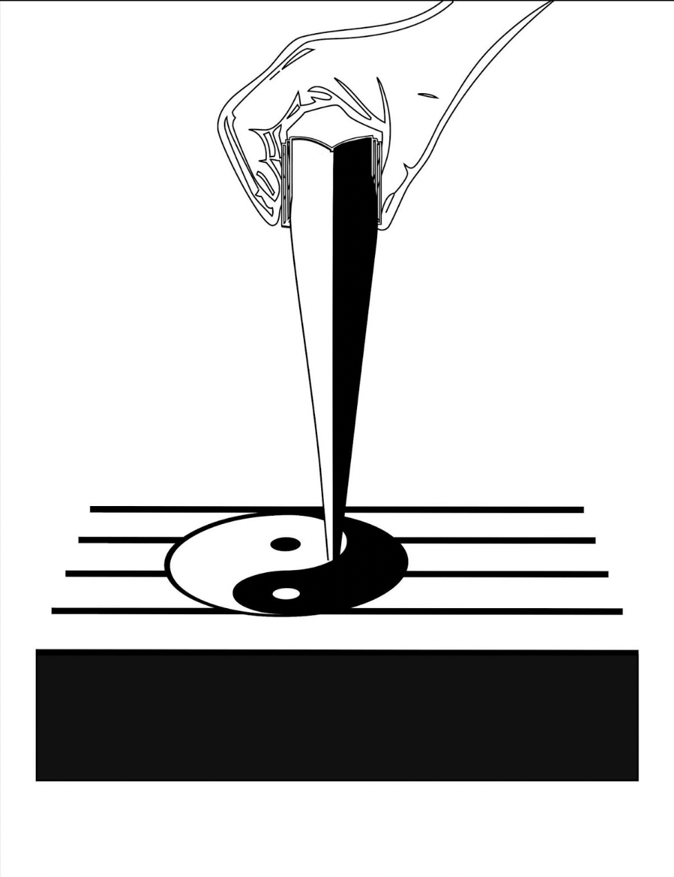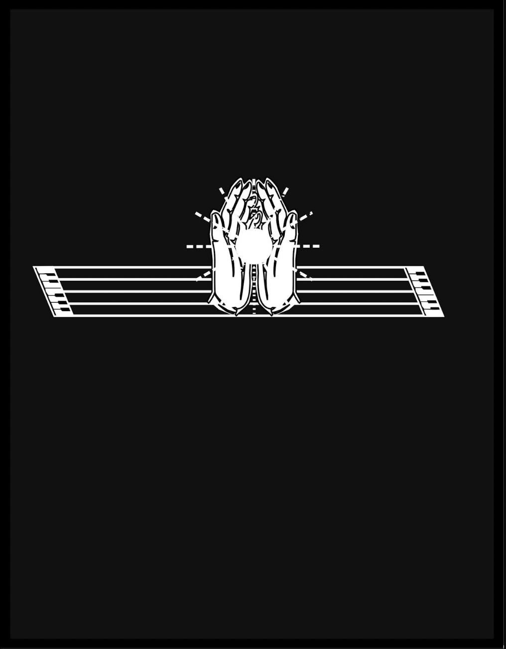 After the descending hand squeezes out the yin yang symbol onto the stave from the image of an open book, Kempton joins this theme of interconnected opposite forces with the development of language, which is where the runes come in, held in an unclosed fist. Eventually the book concludes with an open pair of hands, centered on reversed-out stave/keyboards and holding a point of light radiant against the blackness.