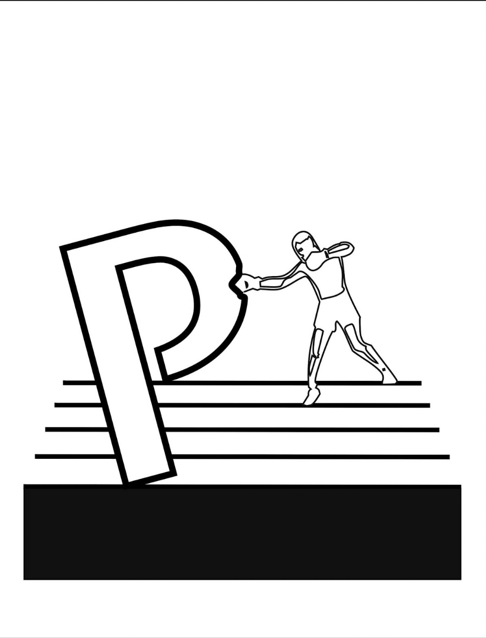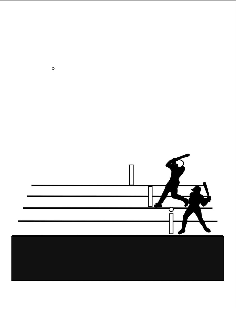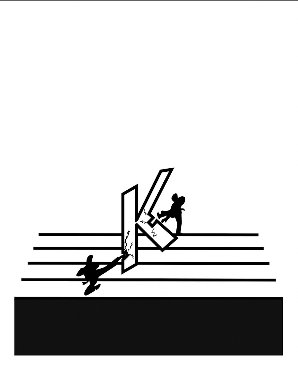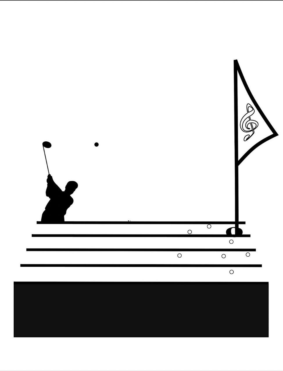 Games and sports are depicted together with letters and punctuation marks on platforms made of the musical staff or stave, all of which offer Kempton multiple means of metaphor. FIrst, inked martial arts figures break a K of karate boards. Then, a baseball player bats the dot of a lowercase i into the air. A basketball player jumps and aims at a basket formed of a half note. A golfer chips toward a half-note hole flagged with a pennant bearing the treble clef G. A boxer punches the bowl of a large P.