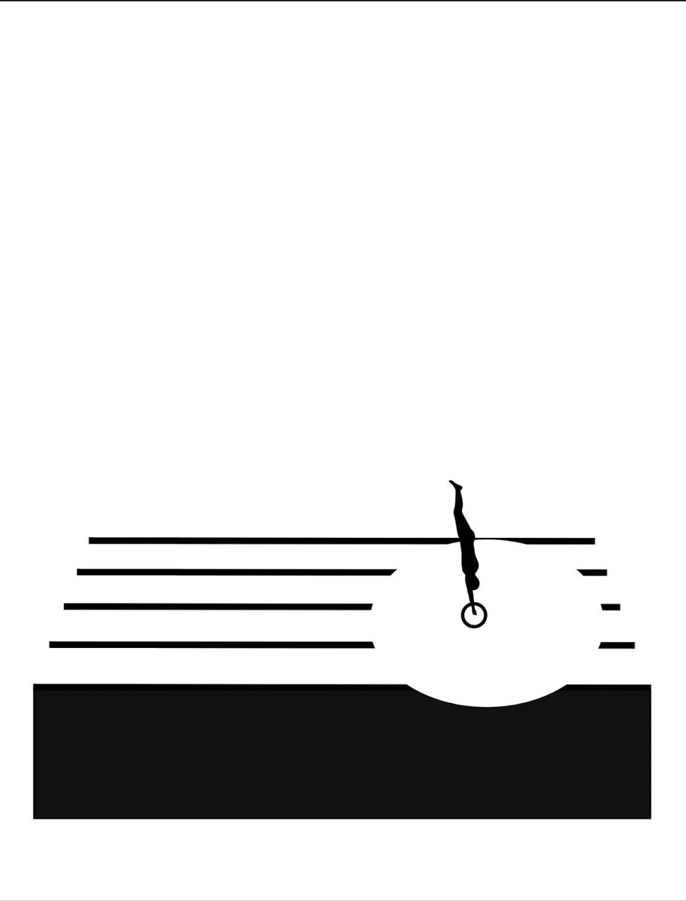 Animation sequences occur, such as the platform diver leaping from the body of a lowercase i and creating an exclamation-point splash in a pool formed by a circle that widens across the stave as the diver submerges.