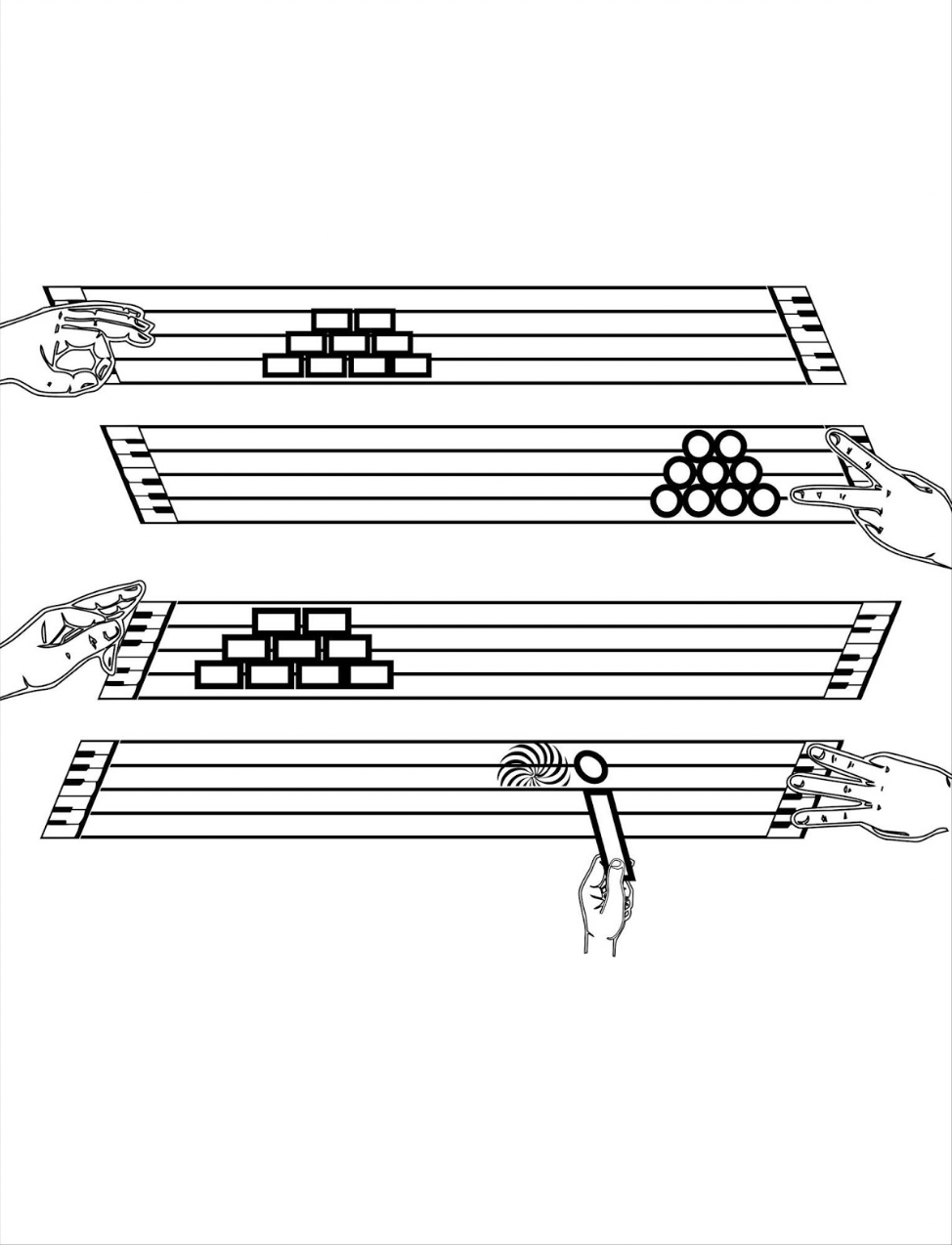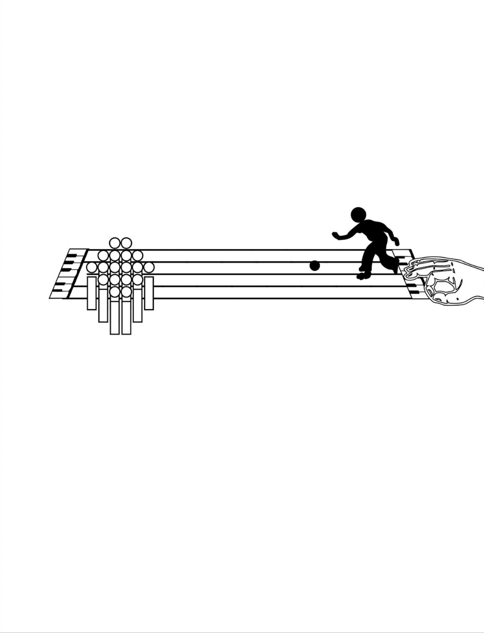 To return to Kempton’s playground, an interlude occurs to associate the alphabet with magnetism, then breaks off to return to the games motif, this time in the form of winter sports. The musical notation motif is still there, but Kempton modifies it with a piano keyboard at both ends of the stave and with manicules fingering the keyboards at both ends while articulating a variation on sign language. Musically and metaphorically, matters become more complex with the introduction of two pairs of staves, pyramids of squares and circles and one manicule using the lowercase i to bring back the magnetism interlude.