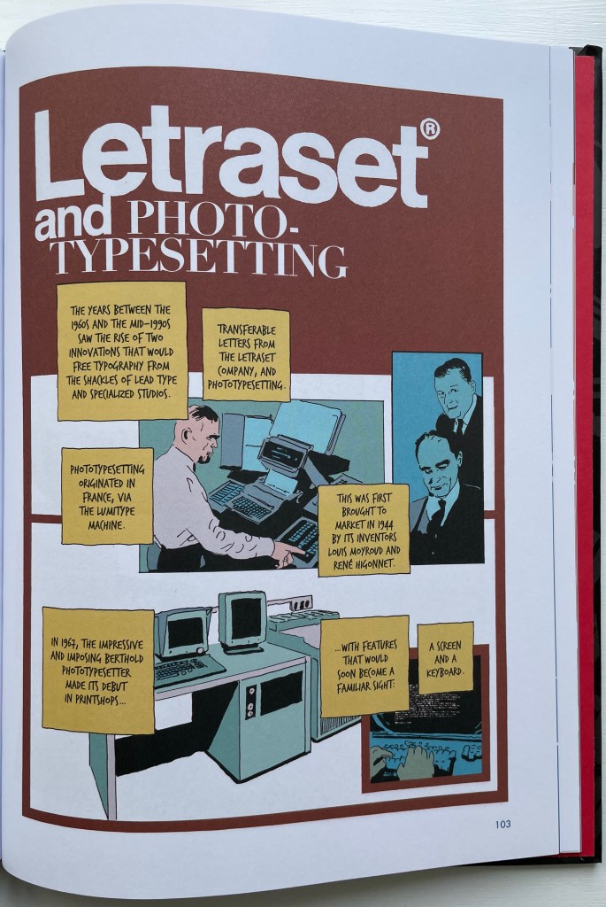 ABC of Typography (2019) David Rault Casebound, sewn, illustrated paper-over-boards cover, endbands, sewn, red doublures. H265 x W195 mm. 128 pages. London: Self Made Hero [Translated from French (Gallimard, 2018)]. Acquired from The Saint Bookstore, 29 June 2023. Photos: Books On Books Collection.