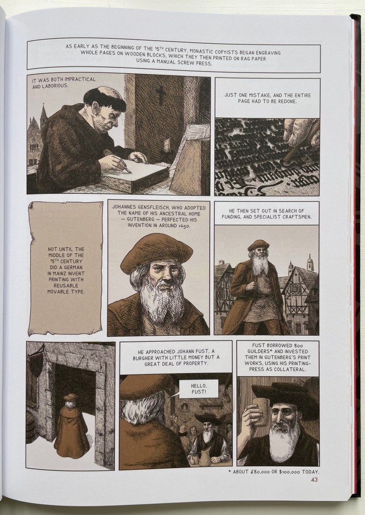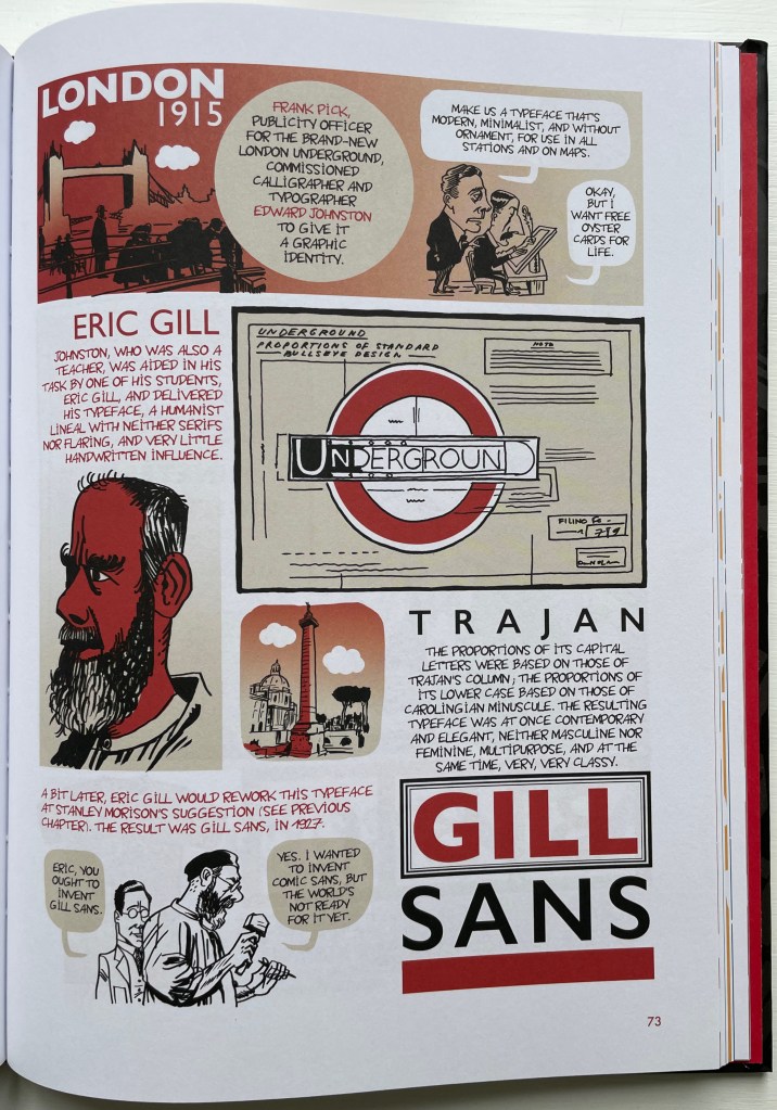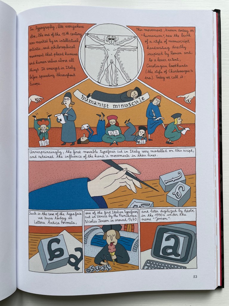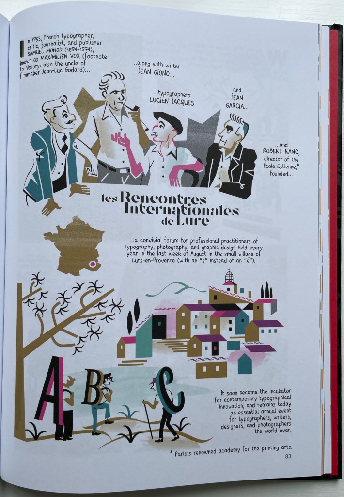 Evident from Clérisse’s recounting of “Les Rencontres internationale de Lure” (an influential annual forum in Provence), Simon’s homage to the typologist Maximilien Vox (one of the forum’s founders) and Ayroles’ positioning of the typeface DIN, the volume’s European roots are never far from the surface, which also makes ABC of Typography a useful and necessary addition to this collection or any shelf of Anglo-centric works about the alphabet, type or design. It’s interesting that, while the French have categorized BDs as the ninth among the ten officially designated arts, typography and design do not yet rate a category. Neither does the livre d’artiste for that matter, which raises a question:
