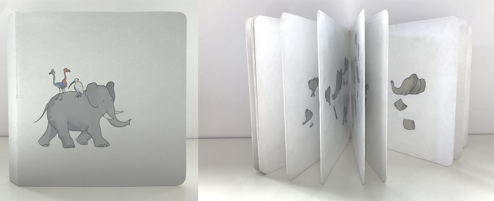 Babar Redacted: ABC Free (2020) Nanette Wylde Based on an altered copy of the board book B is for Babar: An alphabet book by Laurent de Brunhoff. French link exposed spine on tapes. 9″ x 9″ x .5″ closed. Edition of 3. Photos: Courtesy of the artist.