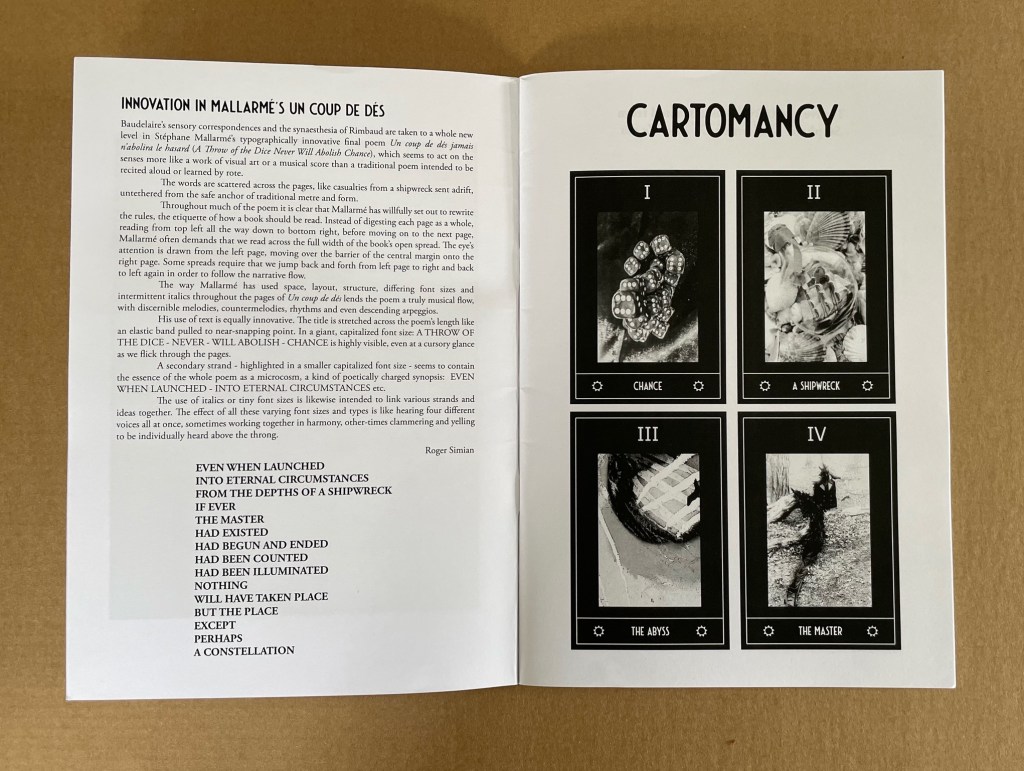 Sarahjane Swan & Roger Simian (the strangely named duo behind Avant Kinema) were responding to an invitation from the AHRC-funded project Imprints of the New Modernist Editing in 2019, which would have resulted in an exhibition at Shandy Hall, home of the Laurence Sterne Trust, but the Covid-19 pandemic intervened. Their response consisted of “visual artworks, photography, poetry, fiction and Tarot style card designs featuring ‘twelve virgin symbols extracted from Un coup de dés‘” (Swan & Simian, “Introduction”). This booklet captures those works and concludes with a new translation of the poem.