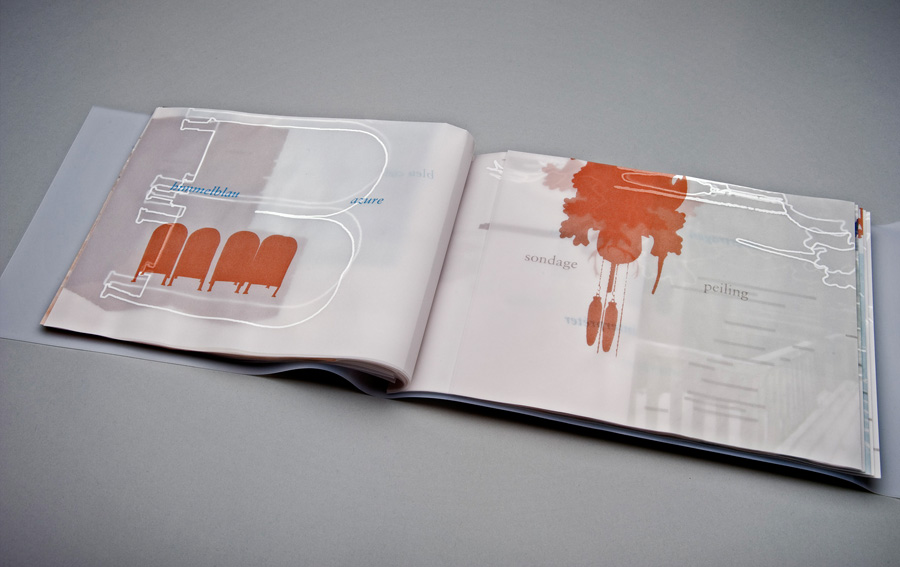 The reason that some words are set in gray roman and others in blue italic goes back the work’s starting point and creative process. Not sure where it might lead, the artists began creating a list of English words in 2001. In 2011, with the aim of creating this book, Deeg and Lollis arrived at the Frans Masereel Centrum in Belgium with design ideas and three lists in hand: the original set (5 words), another in English (5) and one in German (5). When they began the task of translation to create a final list of 30 (15 pairs), the realities of ambiguity and multiple meanings across and within languages arose. Undaunted, they handed over their lists to Belgian artist colleagues to see what clarification an injection of more perspectives, more languages (Dutch/Flemish and French) and therefore chance might bring. The 2001 list appears in gray roman, the 2011 in blue italic.
