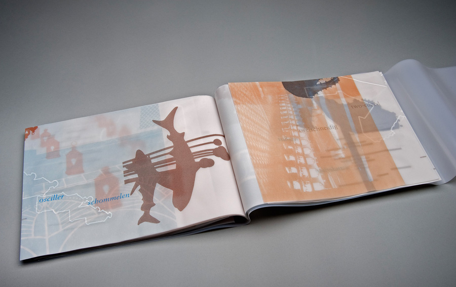The bilingual title suggests that questions of language are in play. Even if, however, the words are recognized as German, English, Dutch/Flemish and French — and understood as rough multilingual synonyms for “transition”, “river”, “flux” and “chance” — a few hints about the rules of the game would help. There is no colophon at the end of the book, but with all the turning over this way and that, one might think to turn the box over. And there it is.