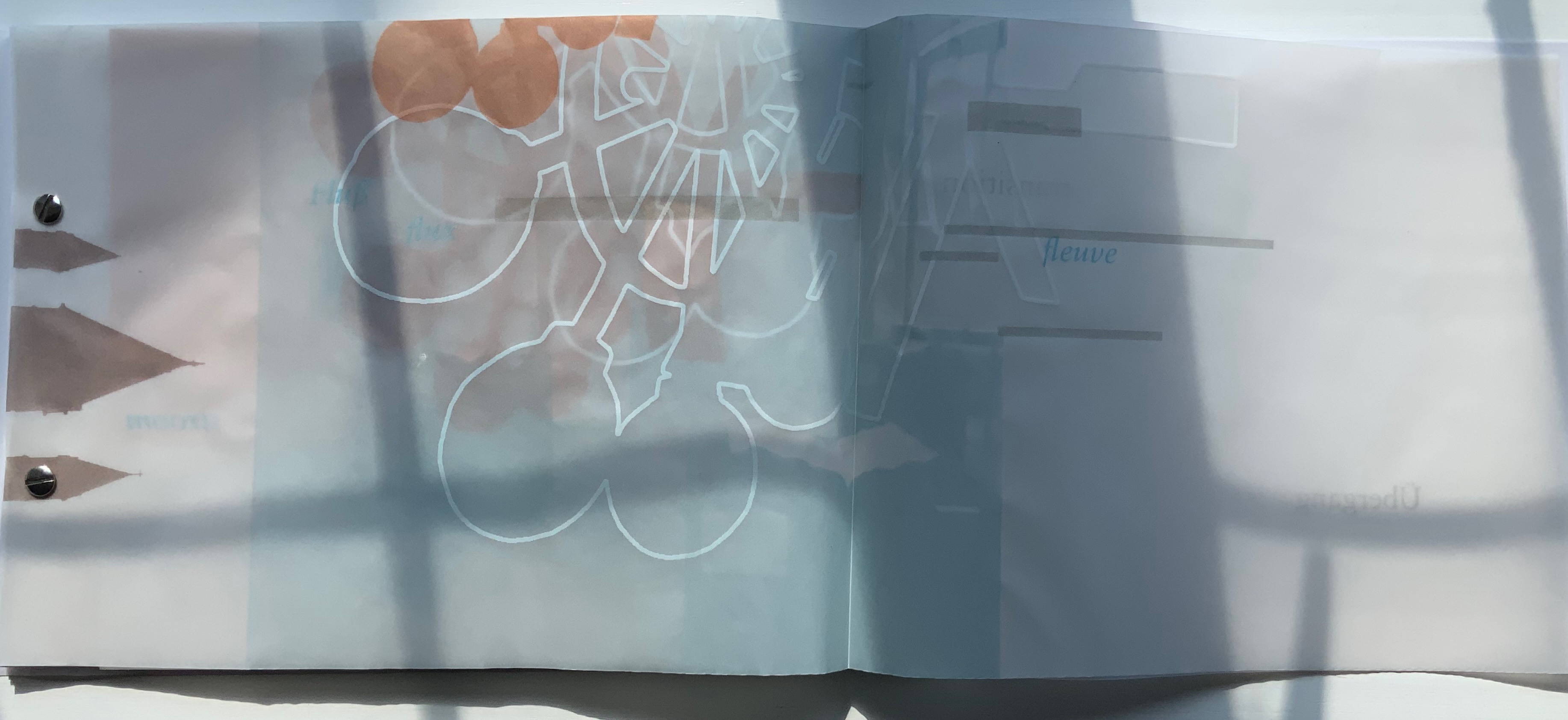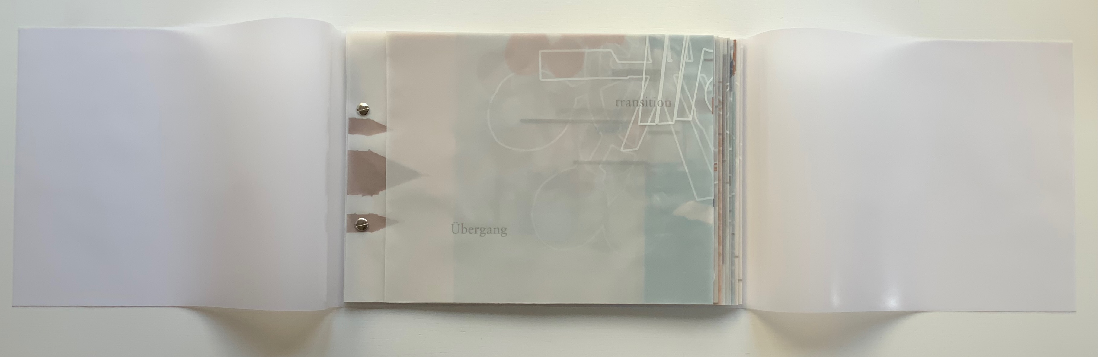 Removed from its greyboard box, this artists’ book by Daniela Deeg and Cynthia Lollis appears clouded by its overlapping layers of vinyl covers. As the top cover turns to the left and the next layer turns to the right, the shine of the covers’ slick side combines with the dull side to create an impression of wet fog, parting to reveal an equally cloudy translucent double-folded leaf of Cristalla paper on which is printed Übergang and transition in the typeface Sabon in roman font and gray. With the Übergang/transition page turned over rightwards, the inner double-page spread shows three words in blue italic: Fluß, flux and fleuve. If the whole Fluß/flux/fleuve spread is turned over leftwards, Übergang/transition reappears on the left along with stroom in blue italic in the center and transition and overgang in gray roman on the right. When the transition/overgang page turns rightwards, the words toeval and Zufall appear in blue italic.