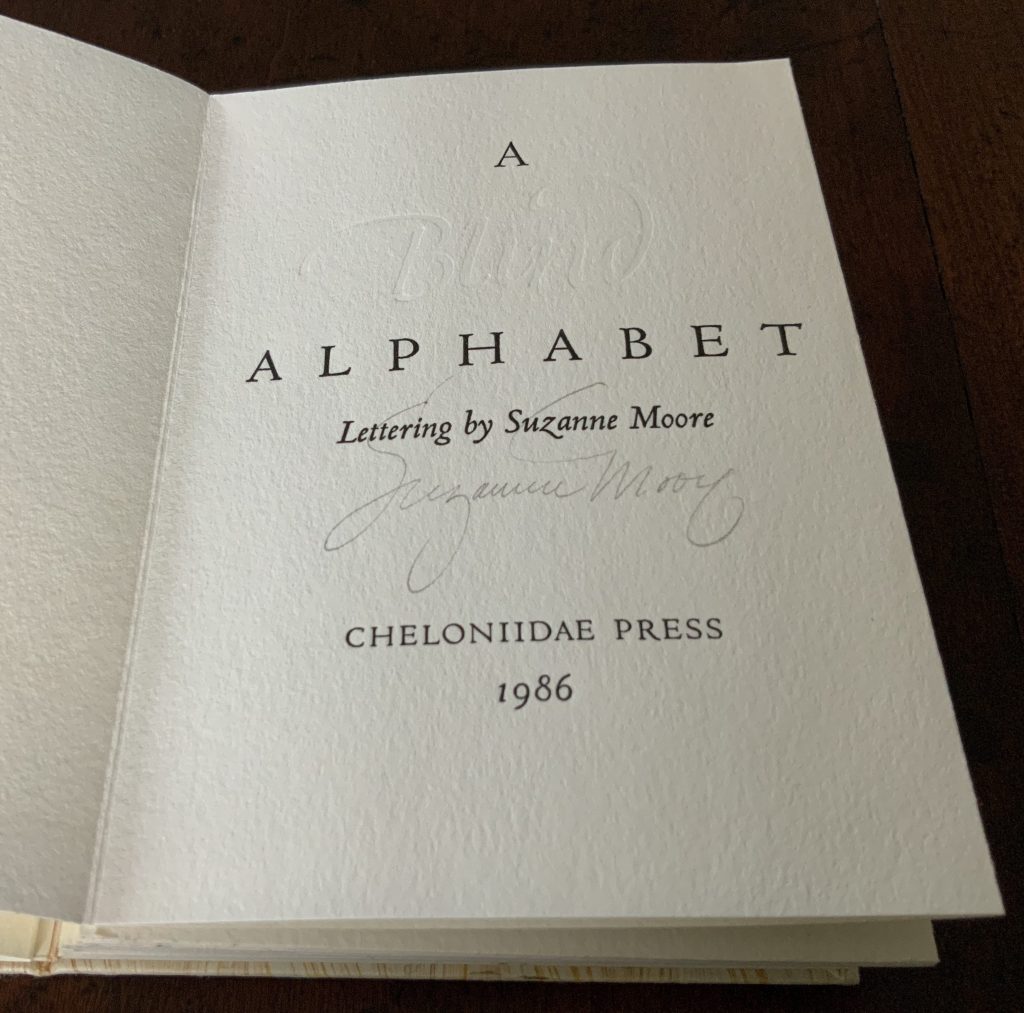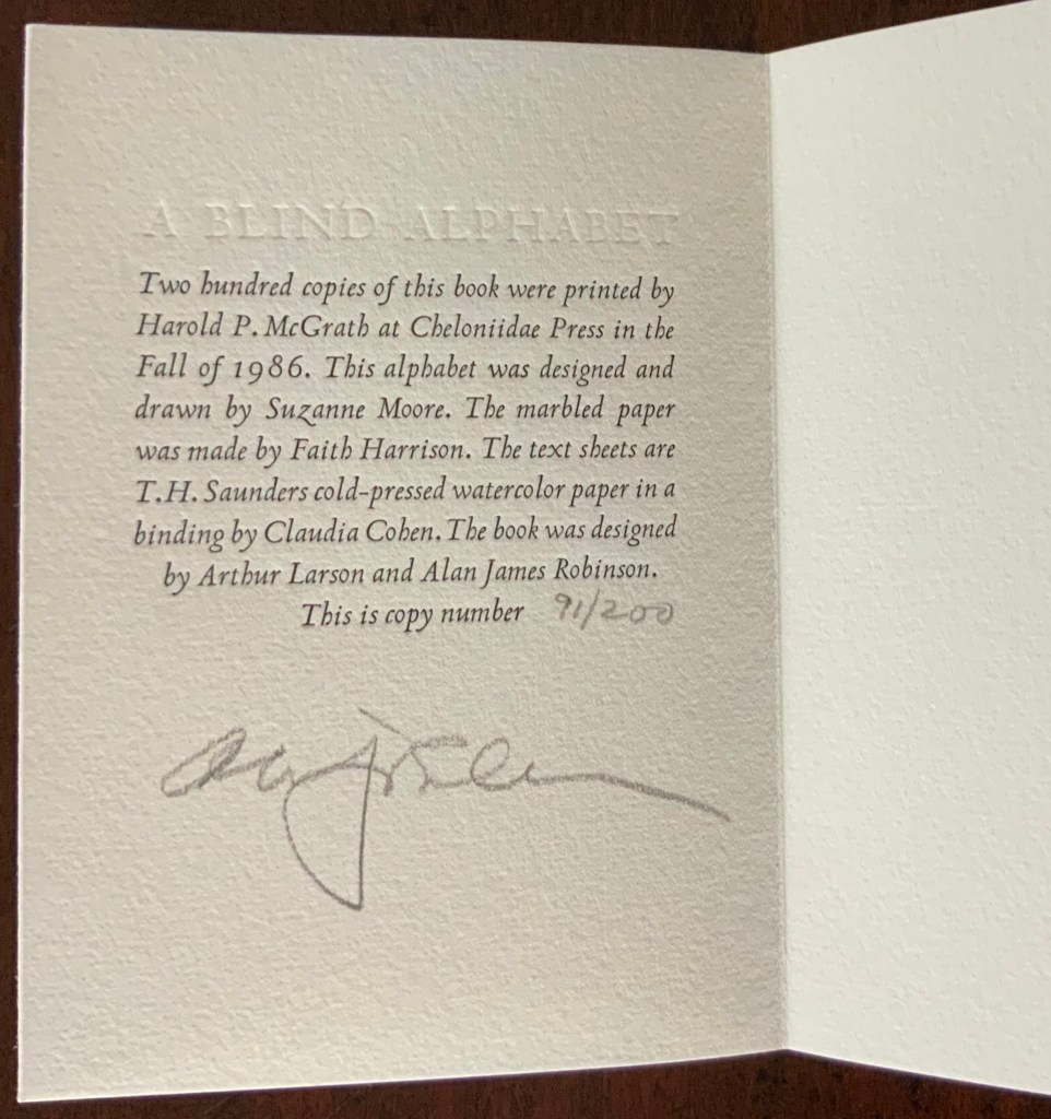 Here, as noted in the colophon to A Blind Alphabet, Moore has the creative role of originating artist, designing and drawing the alphabet — soloist, as it were, in the Cheloniidae Press reportory orchestrated by Alan James Robinson.