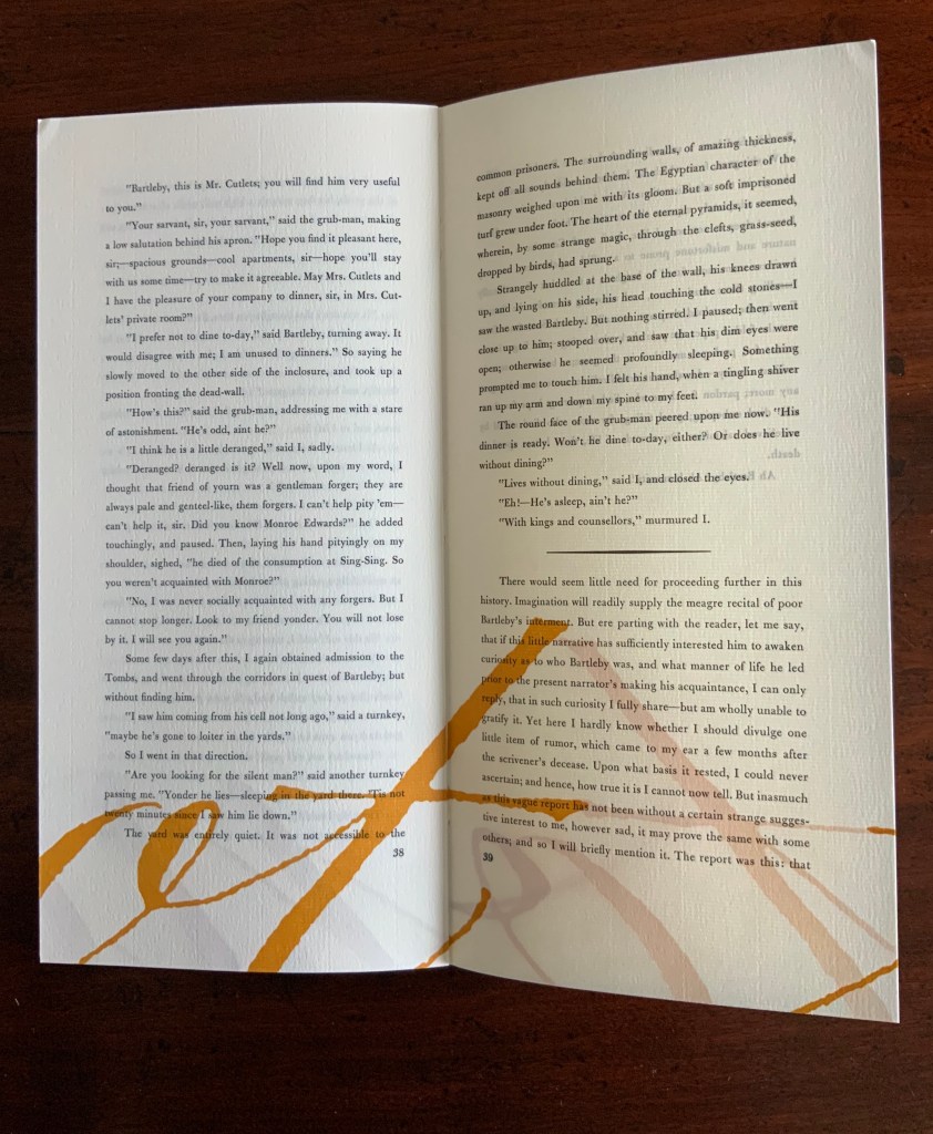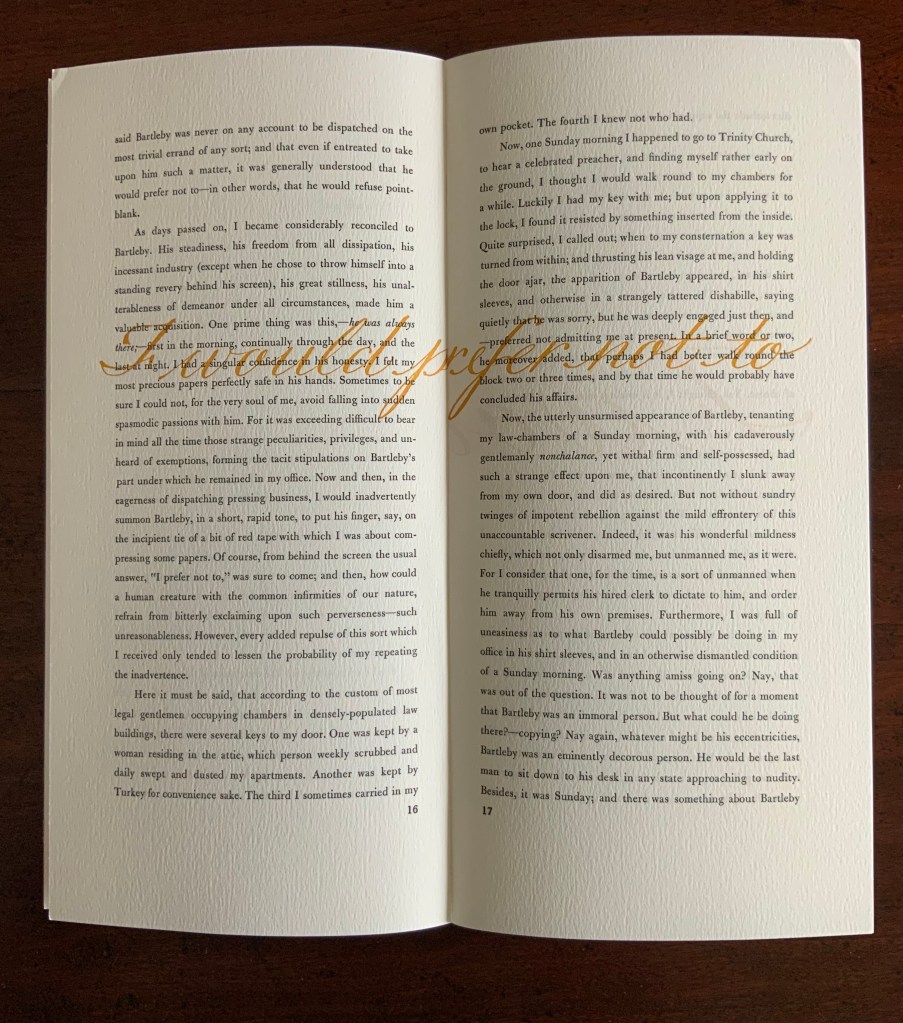 Wilber Schilling (Indulgence Press) orchestrated this edition of Herman Melville’s well-known story. Part of Schilling’s genius was to invite Moore to provide the calligraphy for Bartleby’s hallmark (his only) words “I prefer not to”. Another part was to print Moore’s calligraphy in ever-increasing size in ghostly ochre and in descending position across the pages of the book.