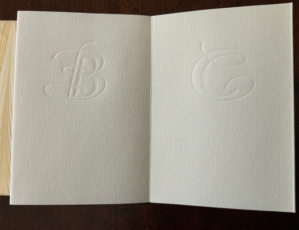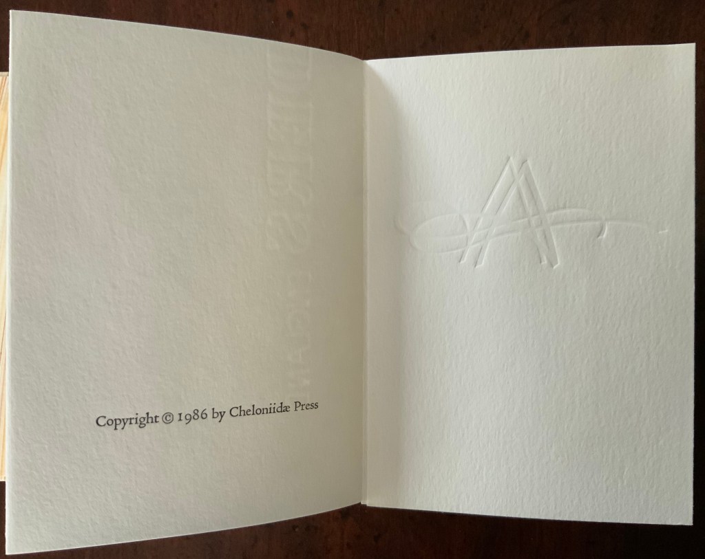 Again, Cheloniidae Press’ master printer Harold Patrick McGrath and “usual suspects” Arthur Larson (hand typesetting), Faith Harrison (hand marbling) and Claudia Cohen (binding) played their roles in this book. Here, Moore has the creative contributing role of designing the alphabet and, for the deluxe and full vellum editions (not shown), hand lettering.