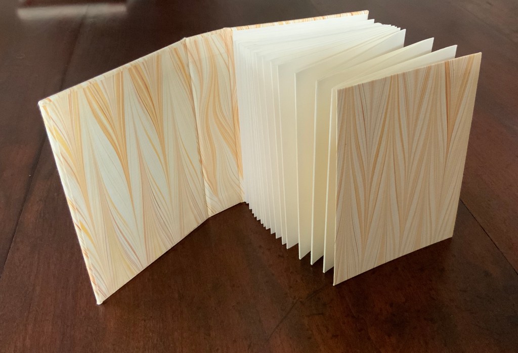A Blind Alphabet (1986) Suzanne Moore Accordion-fold. Closed H128 x W93 D28 (spine) D22 (fore-edge) mm; open 3200 mm. 34 pages. Edition of 200 of which this is #91. Calligraphic letters designed and drawn by Suzanne Moore, printed by Harold McGrath on T.H. Saunders cold-pressed watercolour paper, bound by Claudia Cohen in marbled paper by Faith Harrison. Acquired from Veatchs, 1 May 2018.