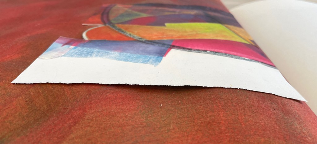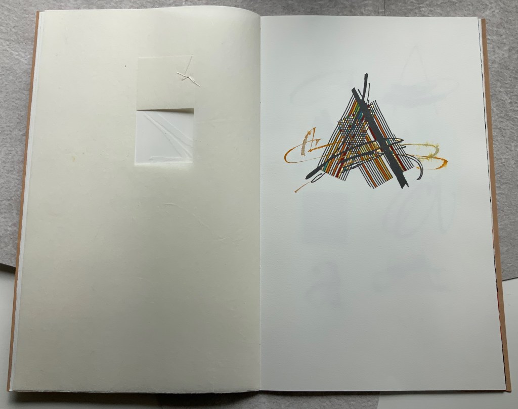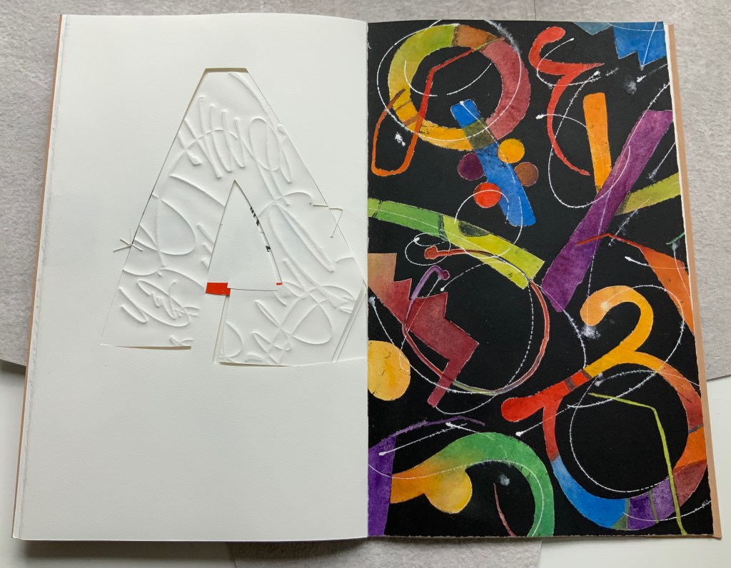 After the title page (see further above), the next double-page spread shows the title page’s debossed A in reverse on the verso page. Facing it is a square cutout through which multicolored lines forming overlapping As appear. Because the cutout page is translucent paper, we can see that the multicolored lines extend into a larger A on the next recto page. Turning the cutout page reveals that the cutout is actually a flap folded up and secured with white thread sewn in the shape of an A. This three-dimensionality of the flap is echoed by the way the crossbar swashes of the facing A seem to swirl around its two legs implying a spinning A.