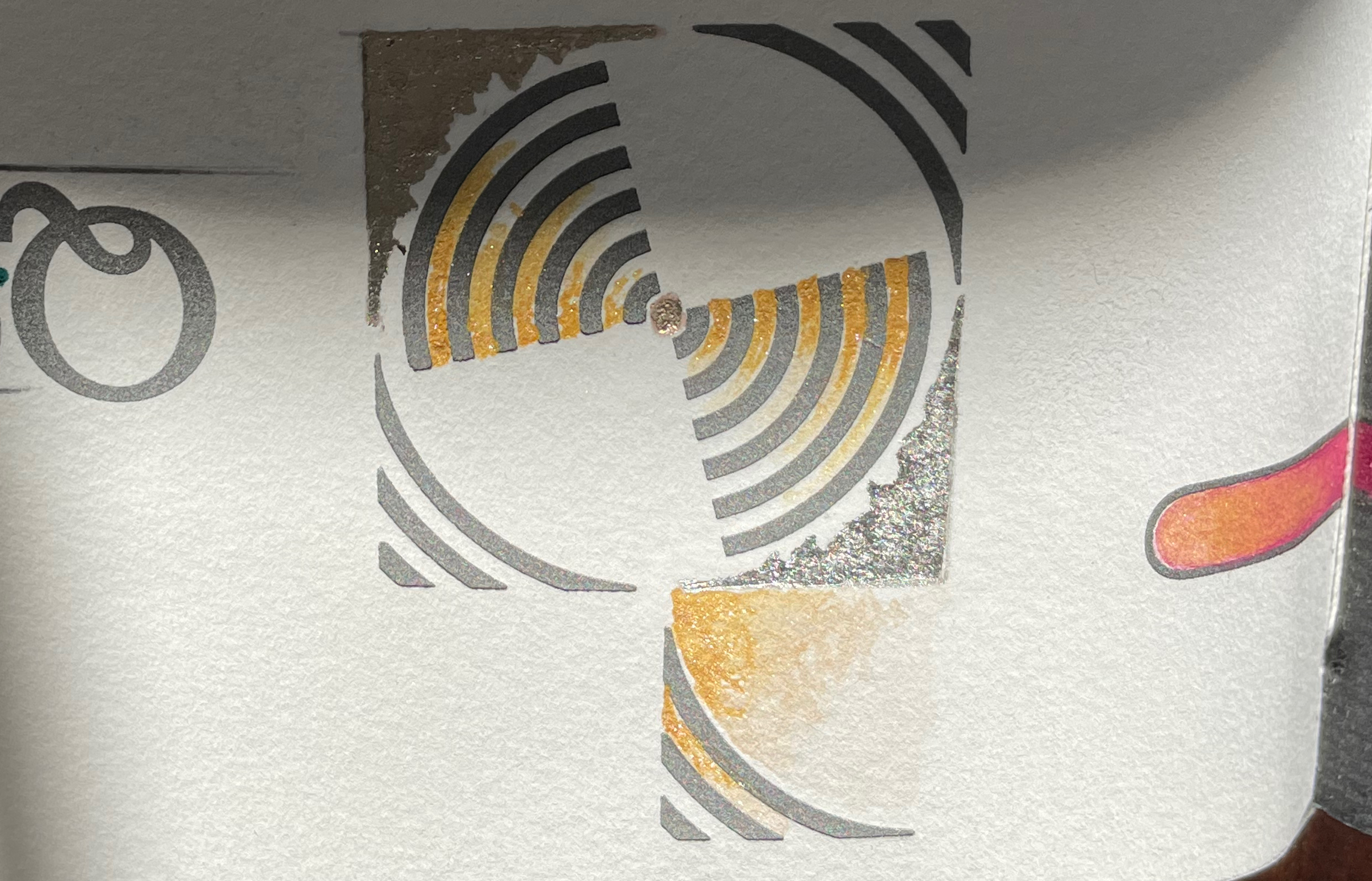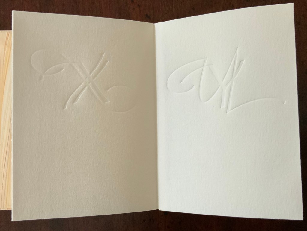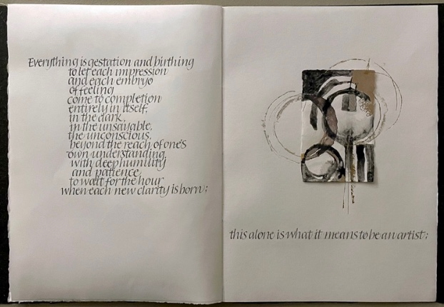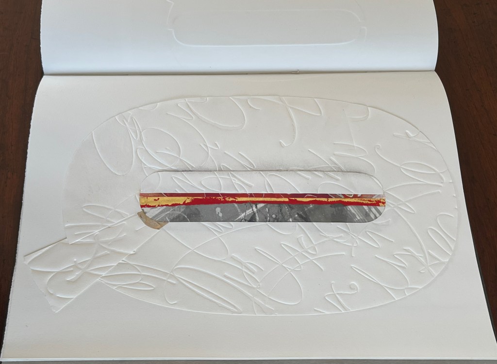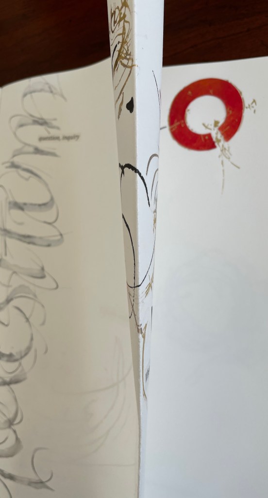 There is much else to muse upon in the spreads above, but it’s in the last two spreads where Moore builds and unfolds a fantasia of calligraphy, color, debossing, cutting, gilding and painting. Notice how the gilt crossbar slots through the page and helps secure the debossed piece behind the cutout to the page.